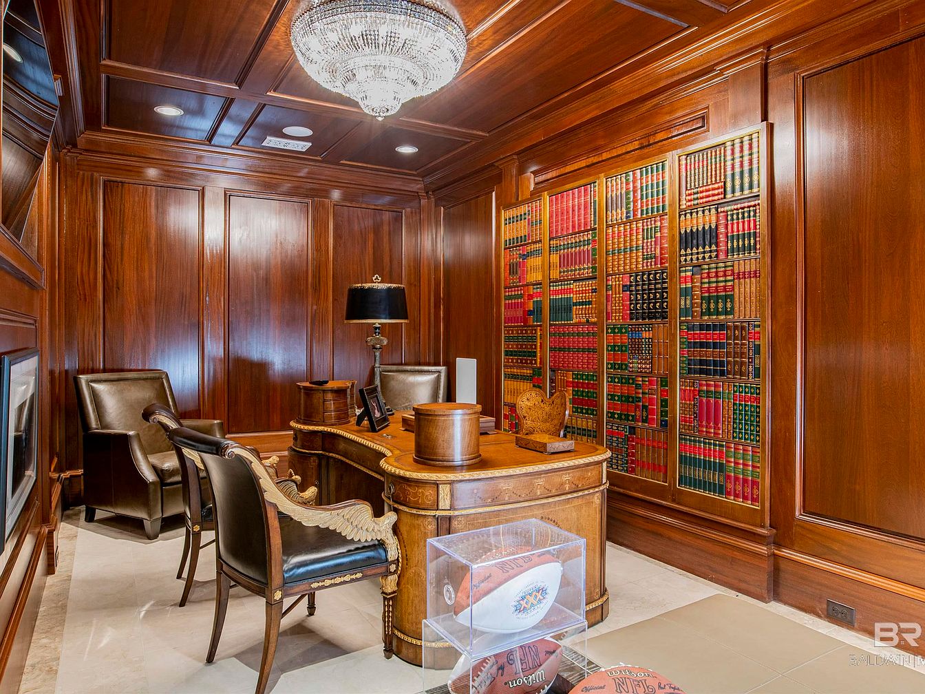 A sophisticated home office featuring rich mahogany paneling creates a warm and inviting atmosphere. A large wooden desk, intricately designed, dominates the space accompanied by elegant leather chairs. Behind the desk, a striking wall of meticulously arranged books adds character and a scholarly touch. A sleek chandelier illuminates the room, enhancing the craftsmanship of the ceiling with its elegant details. Subtle marble flooring contrasts beautifully with the dark wood, while a pair of antique-style lamps provide additional lighting. The overall aesthetic melds classic elegance with functional design, ideal for focused work and relaxation.