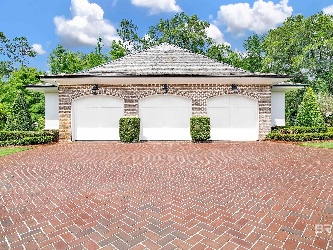 The garage showcases a spacious front adorned with three white garage doors, complemented by elegant arching brickwork above each door. The brick façade combines earthy tones, enhancing rustic charm. On either side of the doors, neatly trimmed greenery frames the entrance, with two small columnar hedges providing symmetry. The driveway features a distinctive herringbone pattern in warm reddish-brown bricks, lending a timeless quality. Above, wrought-iron light fixtures are mounted, casting a welcoming glow in the evening. Lush trees in the background contribute to the serene outdoor atmosphere, showcasing the property’s well-manicured aesthetic.