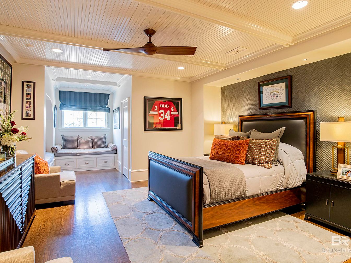 The bedroom exudes a blend of modern comfort and classic elegance, featuring a low-profile bed with a rich wood frame and a plush headboard. Warm neutral tones dominate the color scheme, complemented by patterned throw pillows in shades of orange and gray. A cozy reading nook with a built-in bench under a window invites relaxation, dressed in striped curtains that softly filter light. Wooden flooring adds warmth, while a stylish area rug provides texture. A sleek nightstand and contemporary lamps enhance functionality, and framed artwork on the walls adds personal charm, creating a serene and inviting atmosphere.