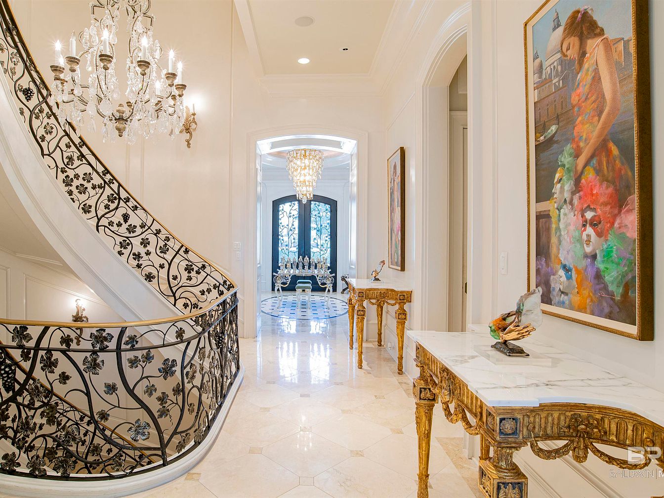 The foyer features a grand double staircase with intricate black iron railings, adorned with floral patterns, leading to the upper level. A sparkling chandelier cascades from the ceiling, illuminating the light cream walls and polished marble flooring, which showcases elegant hexagonal and square tiles. To the sides, opulent side tables with marble tops support artistic sculptures. Large framed paintings add vibrancy to the space, contrasting beautifully with the muted color tones. At the far end, a large window invites natural light, highlighting the sophisticated décor and creating a warm, inviting atmosphere.