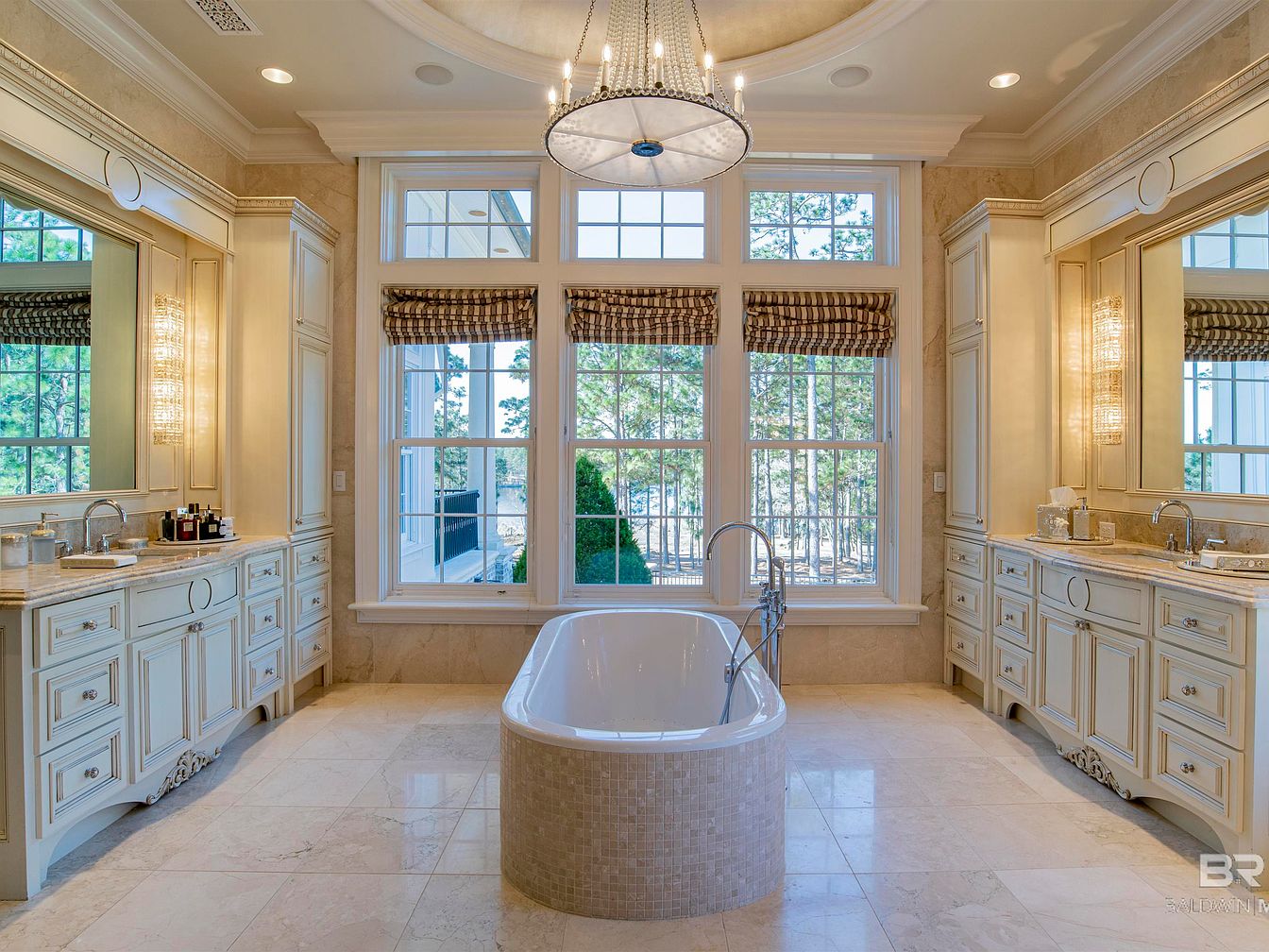 A luxurious master bathroom features elegant design elements and a spacious layout. The color scheme combines soft cream tones with warm beige, creating a serene atmosphere. A freestanding, oval-shaped soaking tub takes center stage, complemented by a polished marble floor that reflects light beautifully. Two large windows dressed with striped valances allow natural light to illuminate the space. Flanking the tub are custom vanities with ornate cabinetry and marble countertops, offering ample storage. Stylish wall sconces provide ambient lighting, while a stunning chandelier hangs from the coffered ceiling, enhancing the room’s opulence and sophistication.