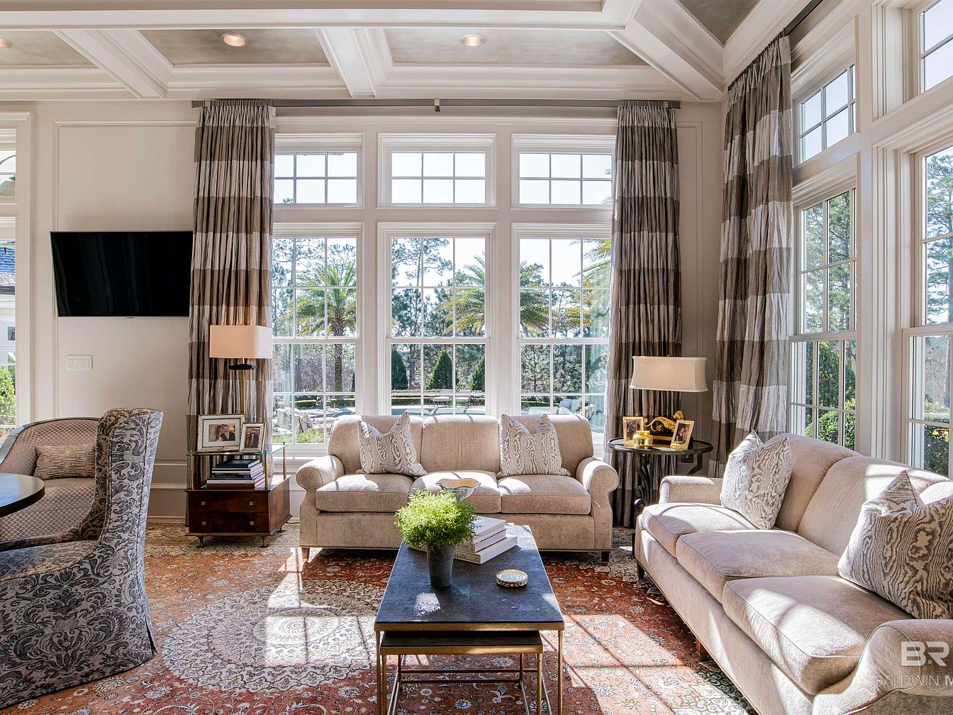 This spacious living room showcases large, multi-paneled windows that flood the area with natural light, revealing a beautifully landscaped exterior. The ceiling features a detailed coffered design, enhancing the elegance of the space. A neutral color palette of soft grays and creams is accented by rich textile patterns on the seating. Plush sofas adorned with decorative pillows offer comfort, paired with an intricately patterned area rug that complements the tones in the room. A stylish coffee table holds decor books and a small plant, while nearby lighting and framed pictures create a welcoming and intimate atmosphere.
