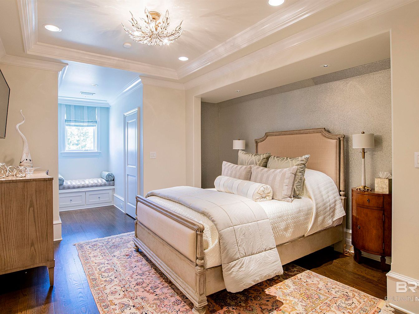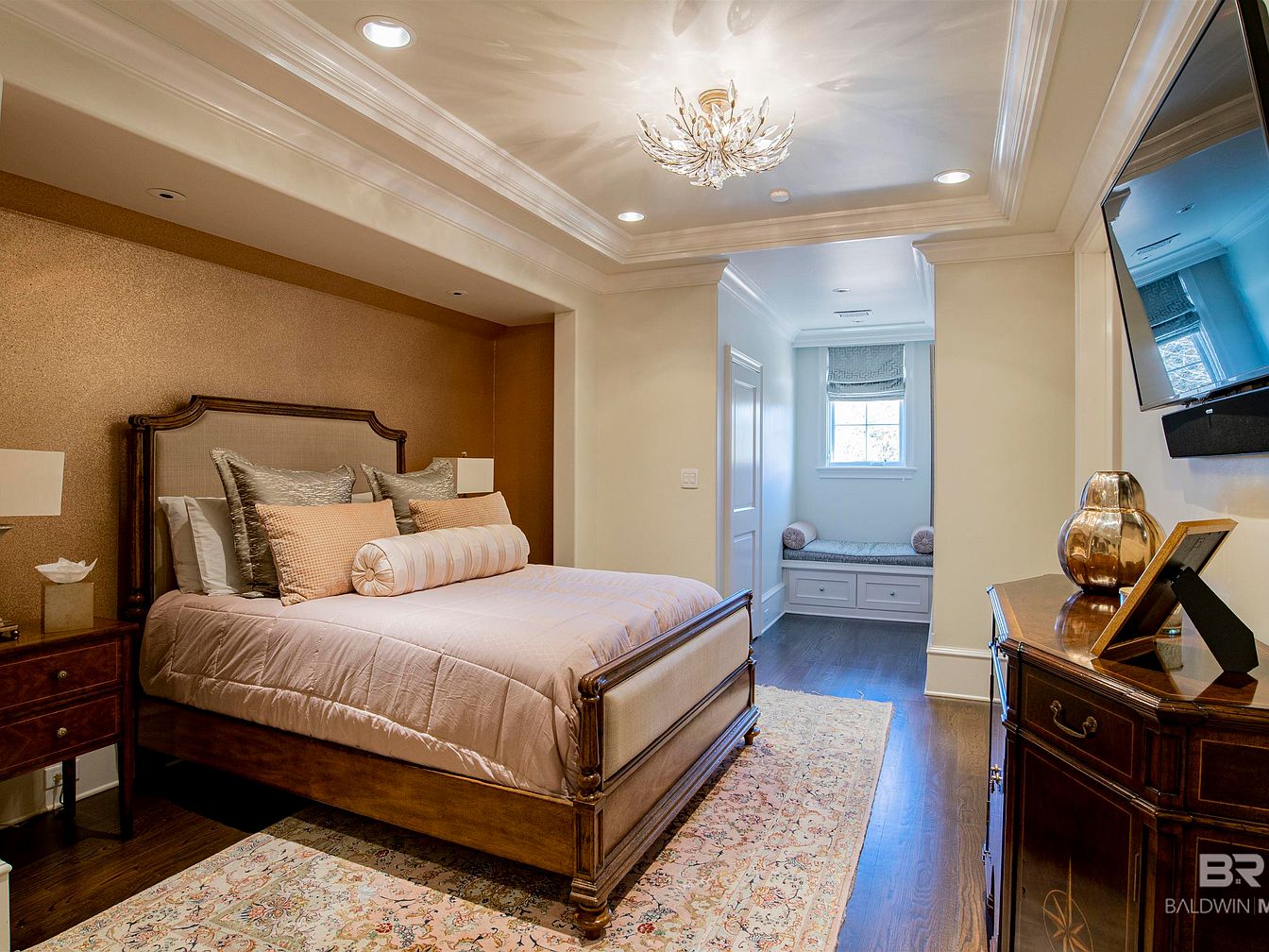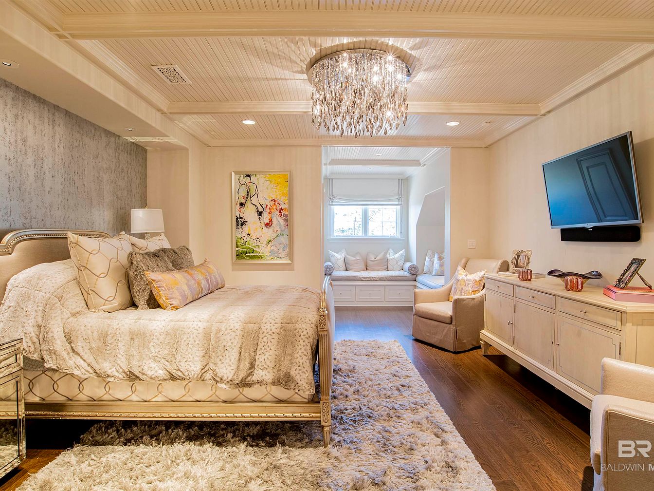 The bedroom features an elegant, inviting layout with a plush, oversized bed adorned with luxurious linens and a variety of decorative pillows. A subtle color palette of soft creams and grays enhances the serene ambiance. Mirrored nightstands reflect light, complementing the glistening chandelier above, which adds a touch of glamour. A cozy, window-side nook offers additional seating, with plush cushions perfectly arranged for relaxation. The rich hardwood floor is partially covered by a soft, large area rug, contributing to the room’s warmth and comfort. An adjacent media console houses a flat-screen television, combining modern convenience with classic design.