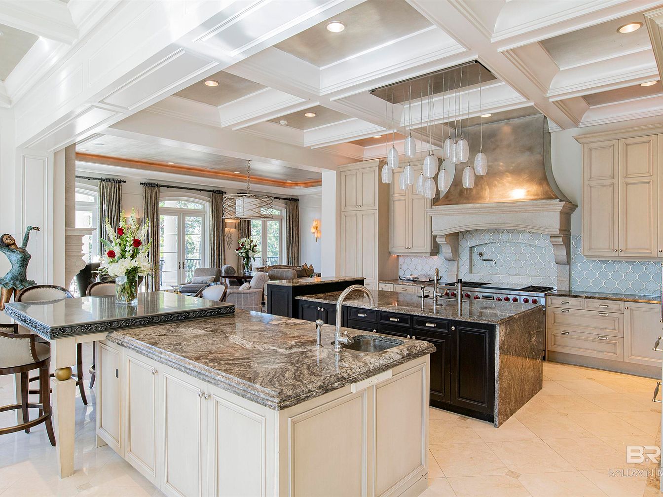 This stylish kitchen showcases an open layout with a blend of modern and classic design elements. The focal point is a large central island featuring a stunning granite countertop with intricate veining. To one side, sleek black cabinetry contrasts elegantly with light beige cabinets, creating a balanced color scheme. The backsplash, adorned with delicate blue tiles, adds a touch of sophistication. Illuminated by unique pendant lights, the space is bright and inviting. Natural light floods the area through large windows adorned with drapery, while decorative accent pieces like floral arrangements and a sculpture enhance the overall charm.