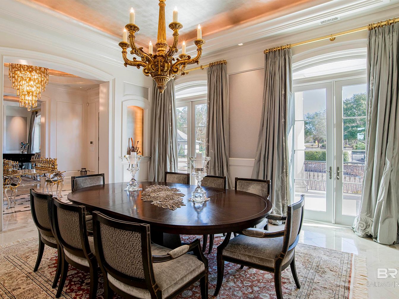 A sophisticated dining room featuring an elegant round table surrounded by upholstered chairs with subtle patterns. Rich, dark wood furniture contrasts with a light-colored marble floor and a stunning area rug that adds warmth. A grand chandelier hangs from the ceiling, complemented by a smaller, intricately designed light fixture nearby, creating a luxurious atmosphere. Elegant drapes frame large windows, inviting natural light and showcasing the garden outside. Architectural details such as decorative moldings and wall panels enhance the room’s grandeur, while a centerpiece of crystal accents on the table reflects refinement and style.