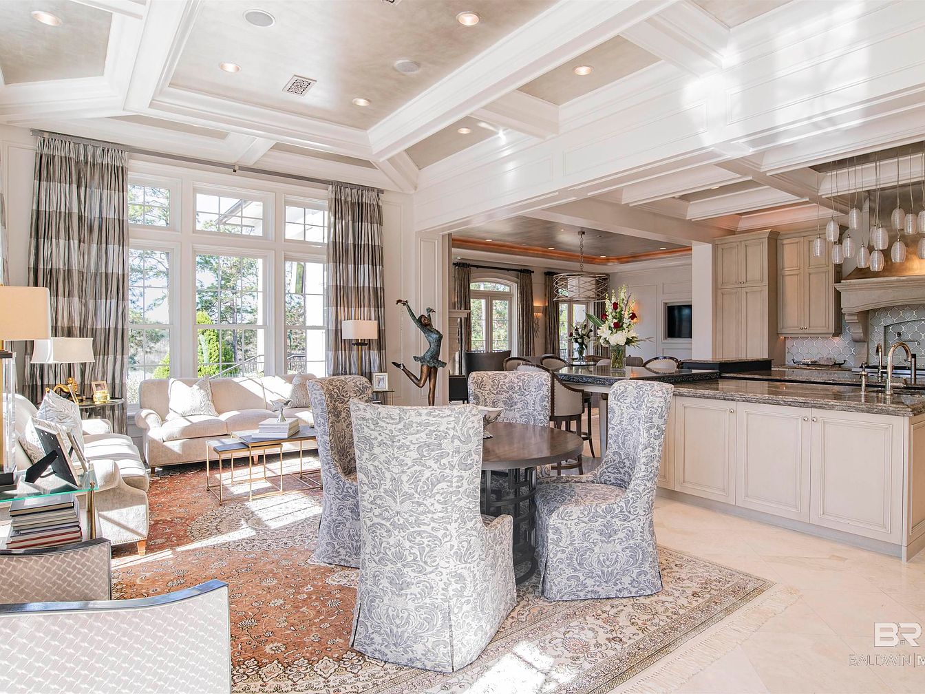 This spacious dining area seamlessly connects to the living space, featuring a round dark wood table surrounded by intricately patterned chairs in soft gray fabric. A rich area rug lies beneath, adding warmth and texture. Natural light floods the room through expansive windows, accentuated by striped drapes that frame the views of greenery outside. The coffered ceiling, painted in a light hue, paired with recessed lighting, enhances the airy atmosphere. Adjacent to the dining setup, a luxurious kitchen layout showcases elegant cabinetry, a marble countertop, and stylish pendant lights, contributing to an overall sophisticated aesthetic.