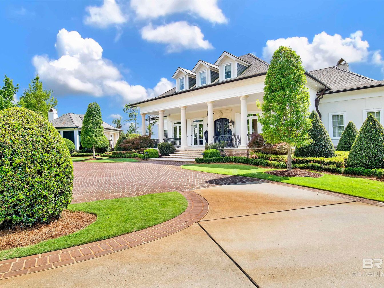 A grand entrance featuring classic American architectural design, characterized by tall white columns and a symmetrical façade. The porch provides a welcoming space with elegant railings and steps leading to large glass doors. The color scheme combines crisp white with dark accents, bringing a refined look. A well-manicured lawn showcases lush greenery, including precisely shaped hedges and ornamental trees, enhancing the property’s curb appeal. The brick driveway, with a herringbone pattern, adds texture and charm as it leads up to the entrance. The backdrop features a bright blue sky with fluffy clouds, contributing to the inviting atmosphere.