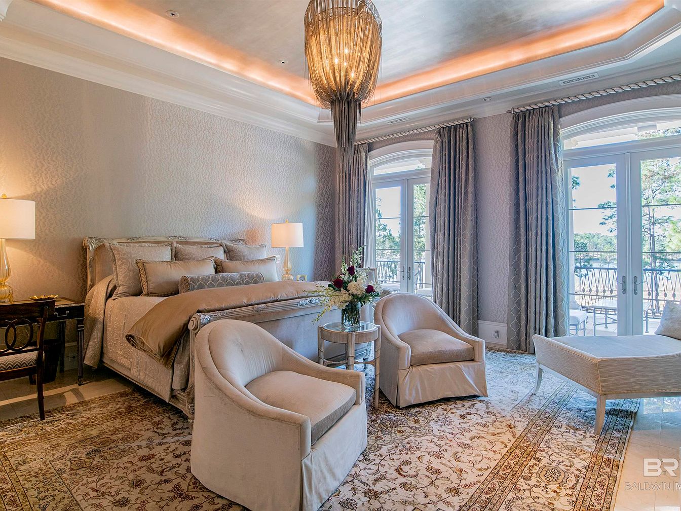 This elegant bedroom features a plush king-sized bed adorned with luxurious bedding in soft neutrals and intricate patterns. The walls showcase a subtle textured design, complemented by warm lighting from stylish lamps on either side. A pair of soft, cream-colored armchairs invites relaxation, positioned on an ornate area rug that adds warmth to the space. Floor-to-ceiling windows framed with rich, patterned drapes offer scenic views while illuminating the room with natural light. A decorative chandelier with a contemporary design provides a focal point overhead, enhancing the room’s sophistication and inviting atmosphere.