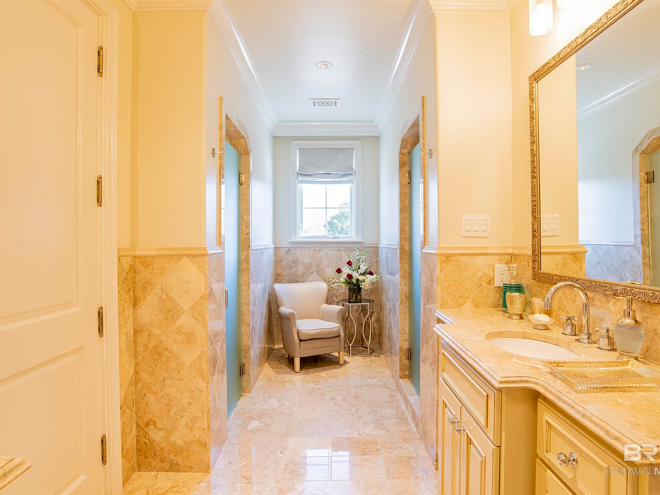 A spacious bathroom passage showcases cream-colored marble flooring that gleams under soft lighting. The walls are adorned with elegant light tones, transitioning to a darker marble midway, creating a sophisticated contrast. A chic chair placed in the corner invites comfort, while a decorative side table adds a touch of charm. Natural light pours in from a window, framed by a soft fabric shade, enhancing the serene ambiance. The sink area features a polished countertop with ornate fixtures, maintaining a luxurious appeal. Decorative elements like a vase of fresh flowers contribute to the refined aesthetic of the space.