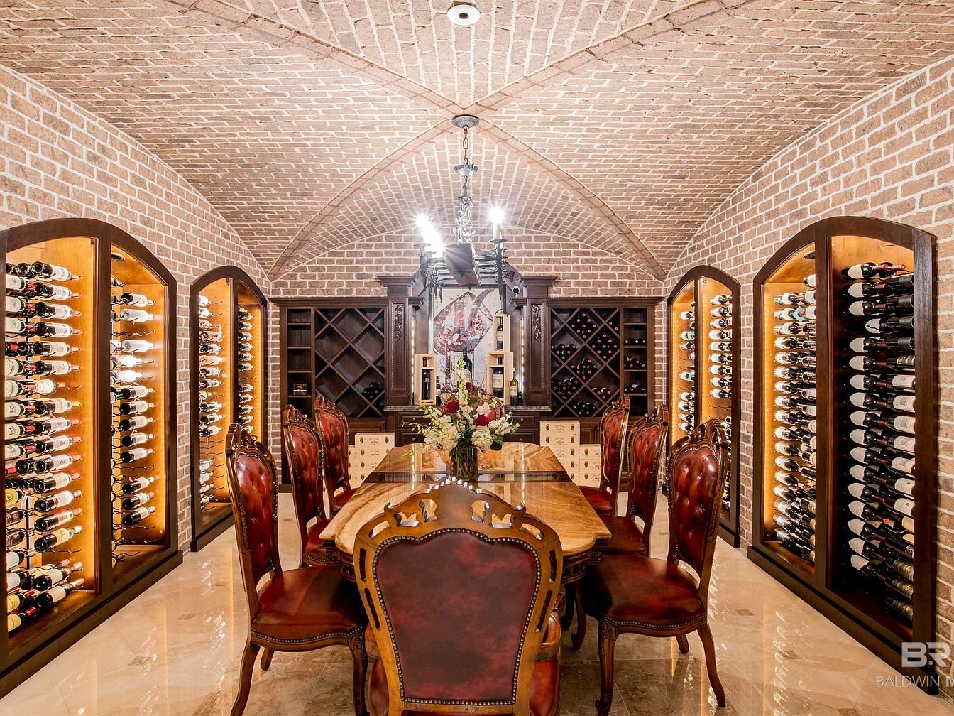 The wine cellar features an elegant, arched brick ceiling that creates an inviting atmosphere. Walls lined with warm-toned wooden racks showcase a vast collection of wine bottles, illuminated to enhance their visibility. A lavish wooden dining table, accompanied by rich, tufted leather chairs, invites intimate gatherings. The glossy marble floor reflects the soft lighting, adding a touch of luxury. Decorative elements include a floral centerpiece and intricate woodwork on the cabinetry, while strategic lighting accentuates the textures and colors of the space, combining rustic charm with sophistication, perfect for entertaining or quiet enjoyment.
