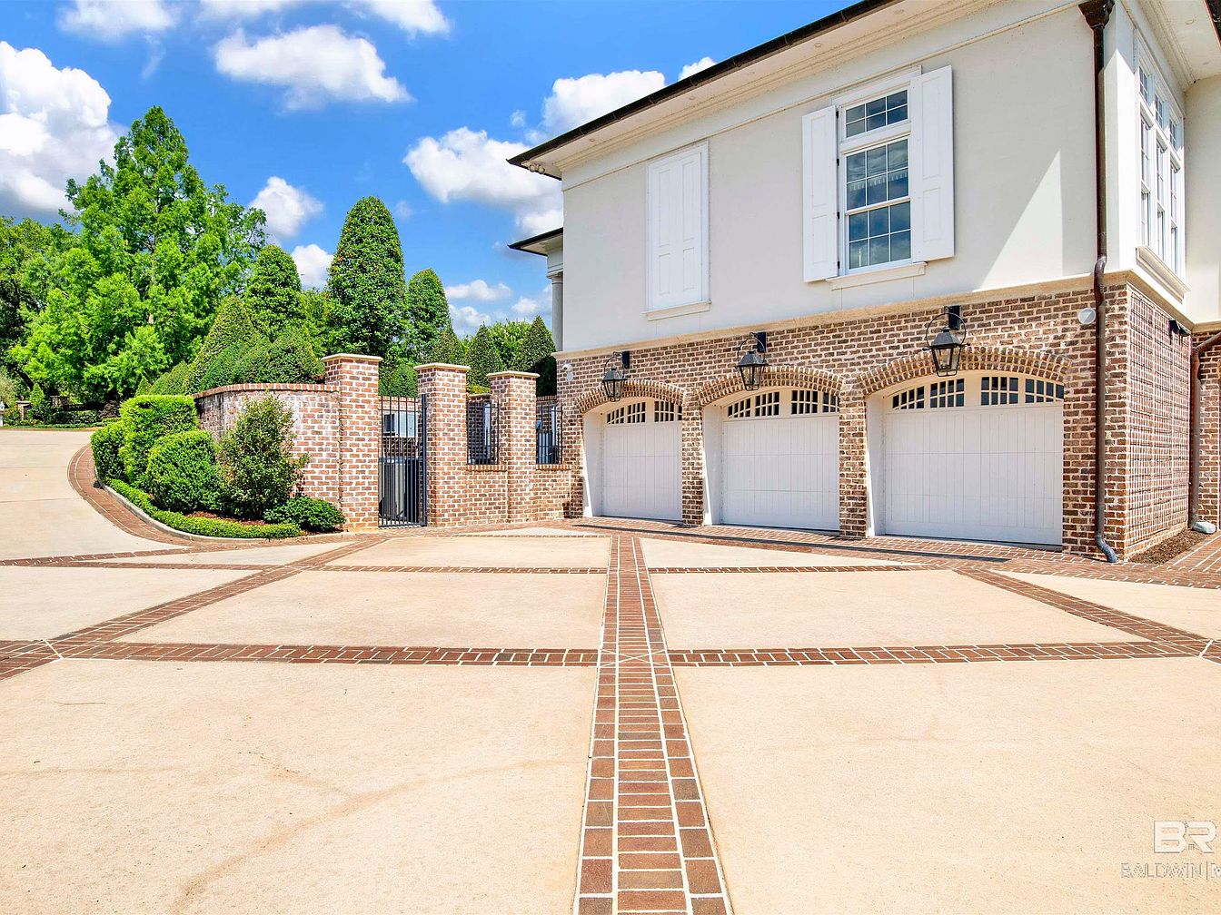 The garage entrance features three large white garage doors set against a backdrop of charming brickwork, providing a textural contrast. Above, stylish lanterns are mounted to enhance the architectural elegance. The driveway, designed with a smooth concrete surface intersected by brown brick patterns, offers a sophisticated touch, leading visitors through a well-manicured landscape. Greenery including tall hedges and topped shrubs creates a welcoming ambiance, while a black wrought-iron gate adds a modern element to the historic aesthetic. The combination of natural elements and structured architecture conveys a sense of refinement and inviting charm.