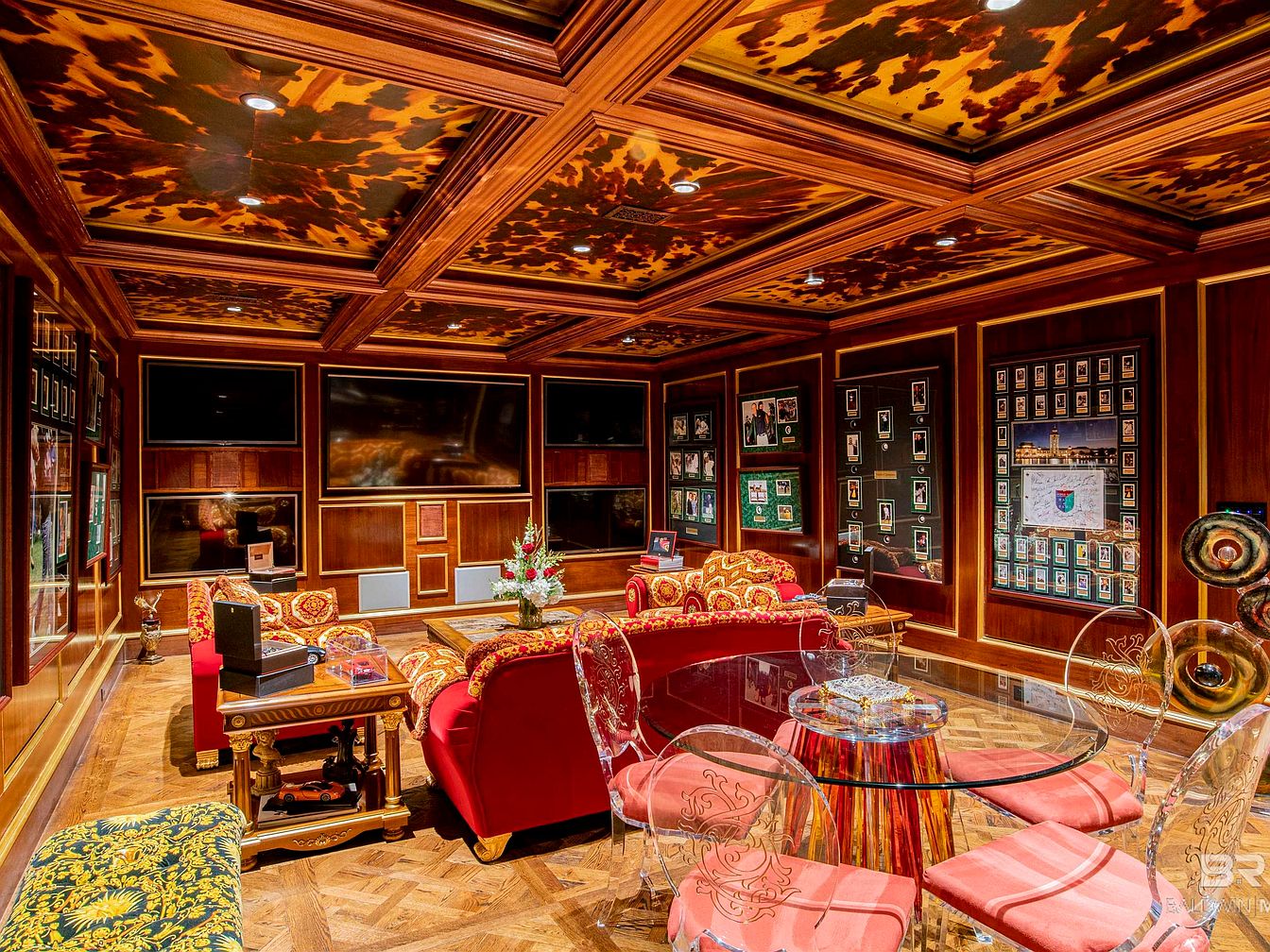 The sitting room features an intricately designed coffered ceiling with a bold, striking pattern reminiscent of animal prints. Rich wooden paneling lines the walls, enhancing the warmth of the space. A combination of plush velvet seating in deep red and vibrant floral patterns provides a luxurious feel. A round glass table adds a modern touch, surrounded by transparent acrylic chairs that contrast beautifully with the traditional elements. Displayed art and memorabilia adorn the walls, blending personal history with elegance. The warm tones and mix of textures create an inviting atmosphere, perfect for relaxation or social gatherings.