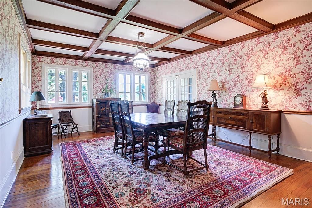 This dining room features a classic rectangular wooden table surrounded by intricately designed chairs. The walls are adorned with a delicate floral wallpaper in soft pink hues, complementing the rich wood of the beams on the ceiling. A patterned area rug with a central medallion adds warmth underfoot, while elegant table lamps provide ambient lighting. Large windows allow natural light to flood the room, enhancing its inviting atmosphere. Antique cabinets and a sideboard display heirlooms, creating a sense of history. The overall aesthetic combines traditional elements with a cozy, lived-in charm, suitable for family gatherings.