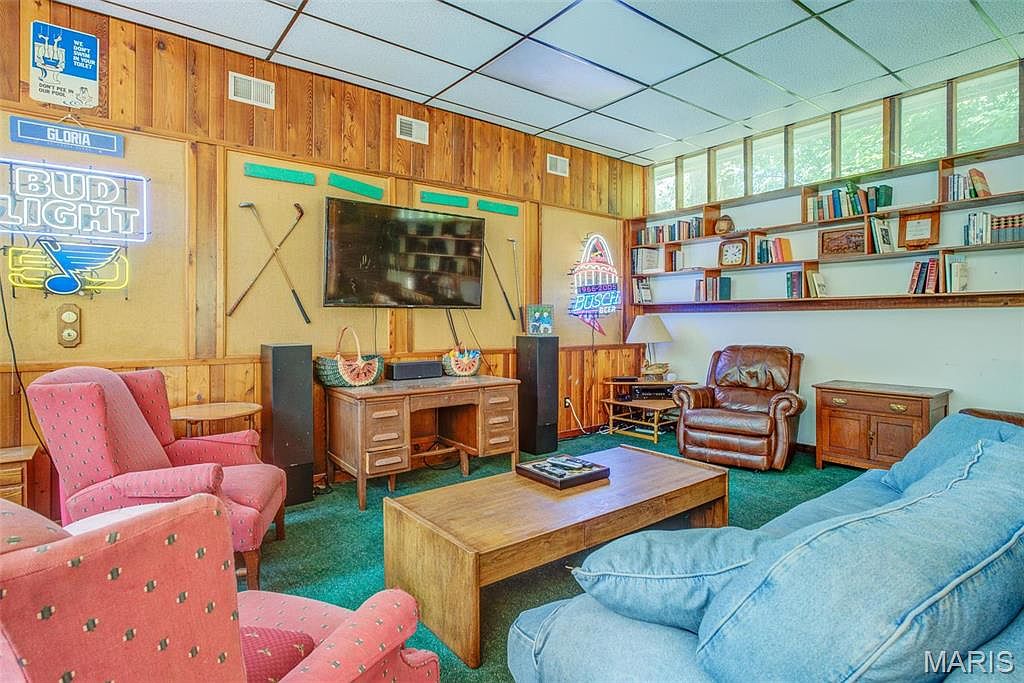 This cozy family room features warm wooden paneling, creating an inviting atmosphere. Soft green carpet complements the natural wood tones and adds comfort underfoot. A brown leather recliner and teal bean bag chair offer relaxed seating options, while two pink patterned armchairs create vibrant accents. A coffee table sits centrally, perfect for gatherings. The wall is adorned with a Bud Light neon sign and sports memorabilia, reflecting a casual, fun vibe. A large television hangs above a stylish wooden console, alongside a bookshelf filled with various books, enhancing the room’s accessibility and functionality.