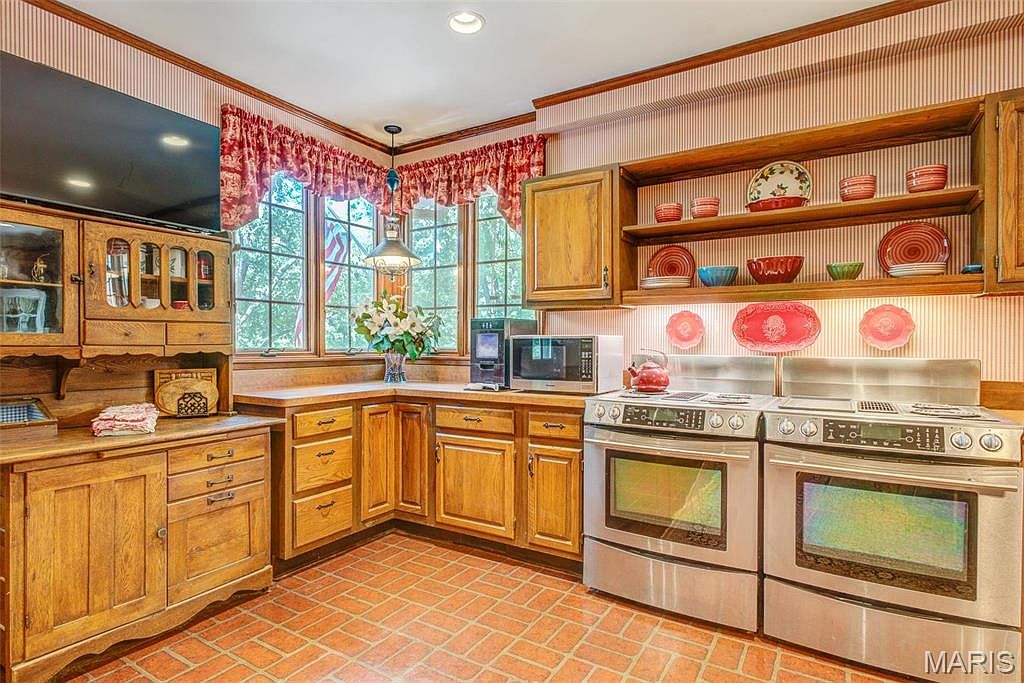 This kitchen features warm wood cabinetry with a natural finish, seamlessly integrating rustic charm into a modern layout. The countertops are visually appealing, complemented by a terracotta tile floor that adds character. A substantial window array allows ample natural light, enhancing the bright ambiance. Striped wallpaper in soft tones creates a cozy backdrop, while open shelving displays colorful dishware, adding a vibrant aesthetic. Stainless steel appliances including double ovens provide a contemporary touch, contrasting beautifully with the traditional design elements such as the antique-style hutch. The overall atmosphere combines functionality with a welcoming, homey feel.