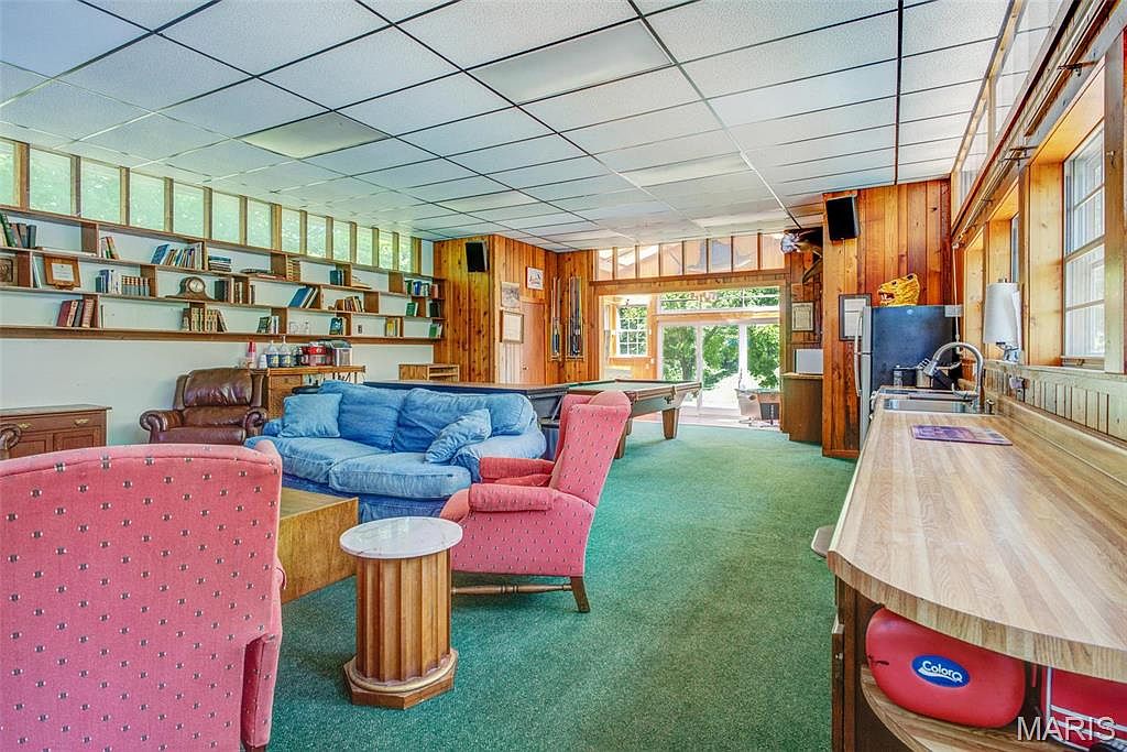 This spacious recreation room features a blend of warm wooden paneling and a vibrant green carpet, creating a cozy and inviting atmosphere. A long, light wooden bar runs along one side, complemented by a small round table made from a similar material. The furniture includes a prominent blue sectional sofa and a pair of pink upholstered chairs, providing ample seating. Shelves line one wall, filled with books and decorative items, while large windows allow natural light to flood the space, connecting indoor and outdoor areas. A pool table adds a playful touch, emphasizing the room’s recreational purpose.