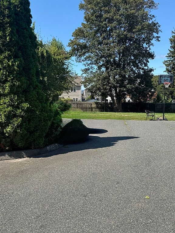 The scene captures a spacious driveway bordered by lush greenery. On the left, a tall, dense shrub creates a natural boundary, while to the right, a large tree provides shade, framing the view. In the background, a residential structure with a muted facade is visible, highlighting its traditional American architectural style. Adjacent to the driveway, a basketball hoop stands invitingly, representing recreational space. A lone bench rests on the edge, suggesting a place for relaxation. The asphalt surface of the driveway is mottled with sunlight, enhancing the inviting outdoor atmosphere of this suburban setting.
