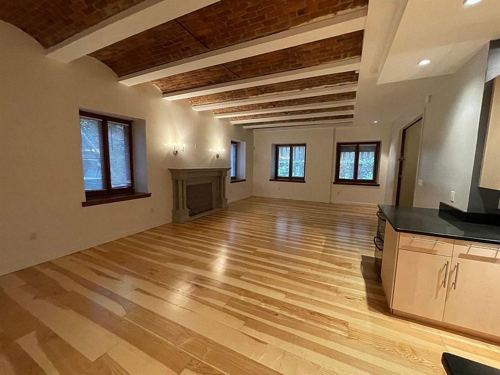 A spacious living room featuring a combination of rustic and modern aesthetics. The room showcases polished hardwood floors with a warm, light tone that enhances the inviting ambiance. Exposed brick ceilings add texture and character, contrasting with smooth white walls. Large windows framed in dark wood provide abundant natural light, creating a bright atmosphere. A traditional fireplace with elegant stone detailing serves as a focal point, complemented by subtle wall sconces that offer soft illumination. To the right, a modern kitchen area is visible, maintaining a contemporary feel with sleek cabinetry and a dark countertop.