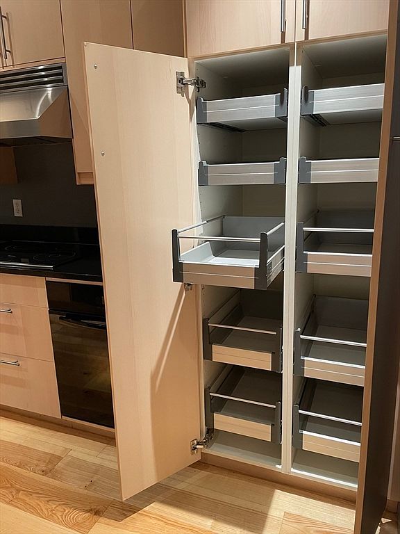 The image shows an organized kitchen storage cabinet featuring multiple pull-out drawers. The cabinet has a soft wood finish, complemented by a sleek black countertop adjacent to it. The tall cabinet structure optimizes vertical space, with light gray metal framing for the drawers enhancing functionality and modern design. The wooden floor adds warmth, contrasting against the contemporary elements. The drawers are neatly arranged, allowing easy access to contents, while the overall layout promotes a streamlined kitchen aesthetic. This clever design merges elegance with practicality, making it ideal for efficient culinary experiences.