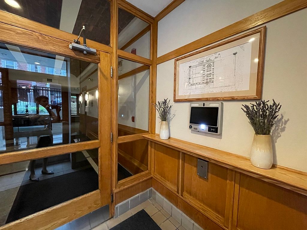 This entryway features warm wooden paneling that conveys a welcoming atmosphere. The large glass doors allow natural light to filter in, enhancing the inviting feel. The walls are decorated with a soft beige hue, providing a subtle contrast to the rich wood tones. On the left, a framed architectural drawing adds a touch of sophistication. Integrated lighting illuminates the space, highlighting key features. Two vases with lavender accents flank a small electronic panel, introducing a modern element to the classic aesthetics. Dark floor tiles lead into the building, establishing an elegant transition from the outside.