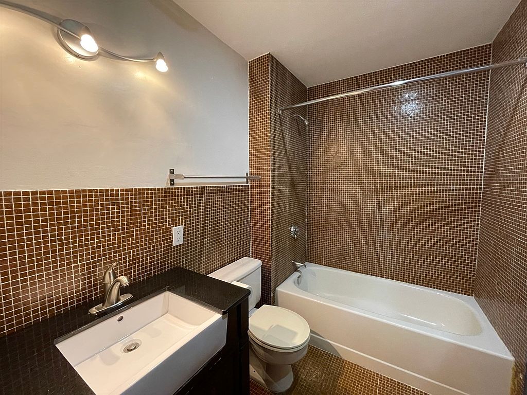 This bathroom features a modern design with an emphasis on clean lines and contemporary aesthetics. The walls are adorned with brown mosaic tiles that create a warm, inviting atmosphere, complemented by a contrasting white tub and sink. A sleek black countertop adds a touch of elegance, while the stainless steel faucet enhances the modern feel. Adequate lighting is provided by a wall-mounted fixture that softly illuminates the space, highlighting the textured tile work. The layout includes a shower-tub combo, making efficient use of space while maintaining a stylish appearance. Overall, the bathroom combines functionality with a chic, cohesive look.
