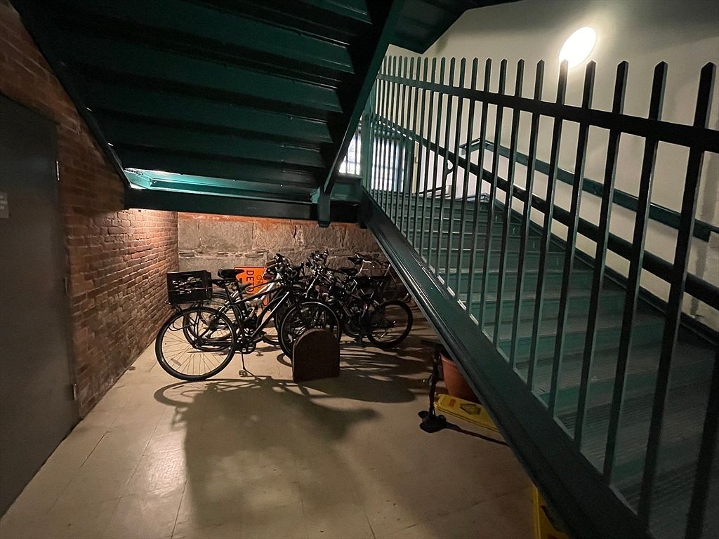 A stairwell space characterized by its industrial charm, featuring a green metal staircase that extends upward. The walls are exposed brick, blending rustic elements with modern convenience. A few bicycles are neatly arranged at the bottom, hinting at the active lifestyle of the home’s inhabitants. The floor is tiled, enhancing durability and ease of maintenance. Ambient lighting comes from a circular ceiling fixture, illuminating the area softly. A wooden crate, perhaps for storage, sits amidst the bicycles. The overall aesthetic combines functionality with a touch of vintage style, creating an inviting yet practical atmosphere.