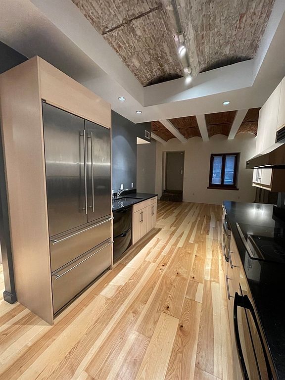 This modern kitchen features a spacious layout with sleek, stainless steel appliances and contemporary cabinetry. The refrigerator stands out with its minimalist design, reflecting a blend of functionality and style. Dark countertops contrast vividly with light wood flooring, highlighting the warmth and elegance of the space. Exposed brick beams above add a historic touch, arching nicely against the modern aesthetic. Walls painted in a muted tone enhance the overall brightness, allowing natural light to flow through the space. A large window invites in outdoor views, completing the harmonious blend of contemporary and traditional design elements.