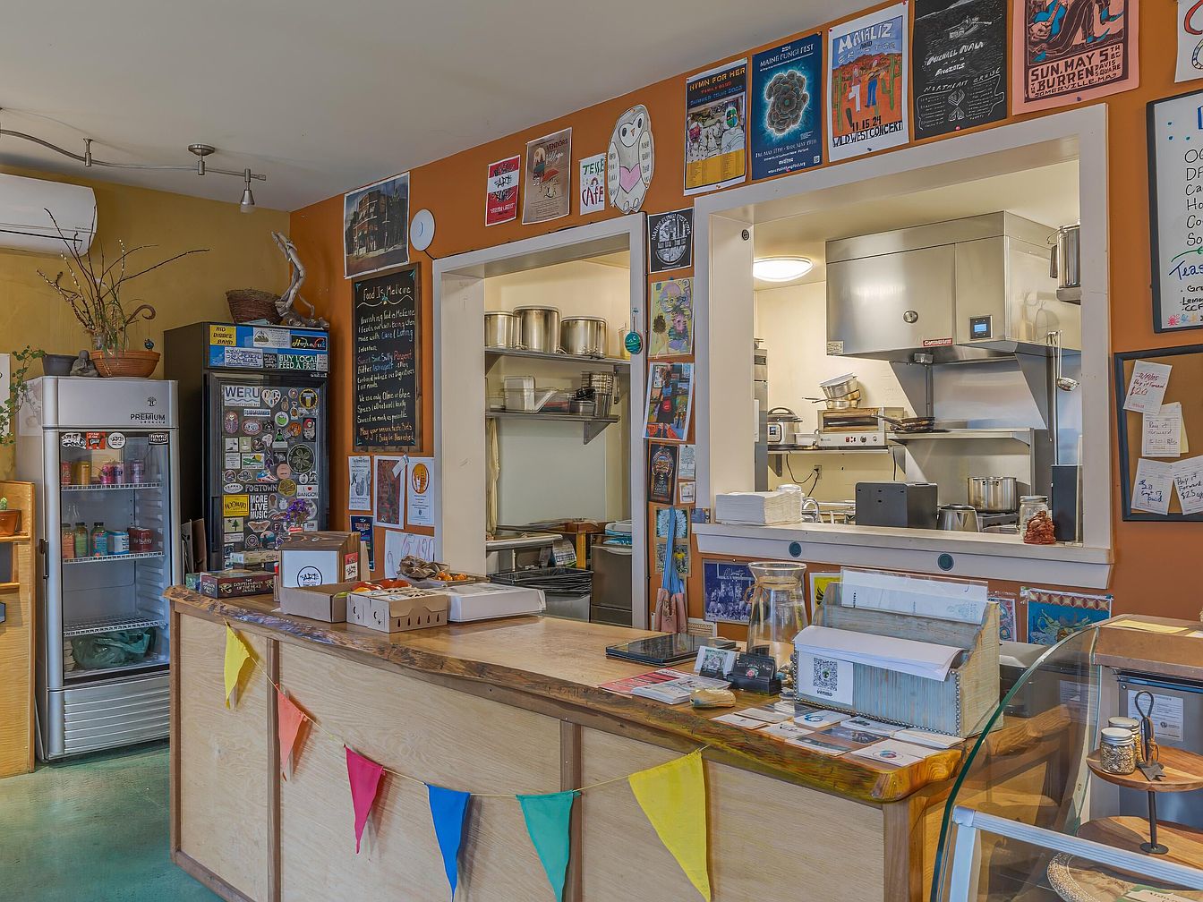 The cafe features a vibrant, warm color scheme with orange walls adorned with eclectic posters and artwork. A wooden counter runs across the front, topped with a selection of pastries and flyers, enhanced by colorful triangular bunting. To the left, a chrome fridge displays an assortment of drinks, covered in stickers that add character. Behind a serving hatch, the kitchen is partially visible, showcasing stainless steel appliances. The flooring is a cool blue-green, contrasting the earthy tones of the woodwork. This lively space invites patrons to relax in a cozy and artistic atmosphere.