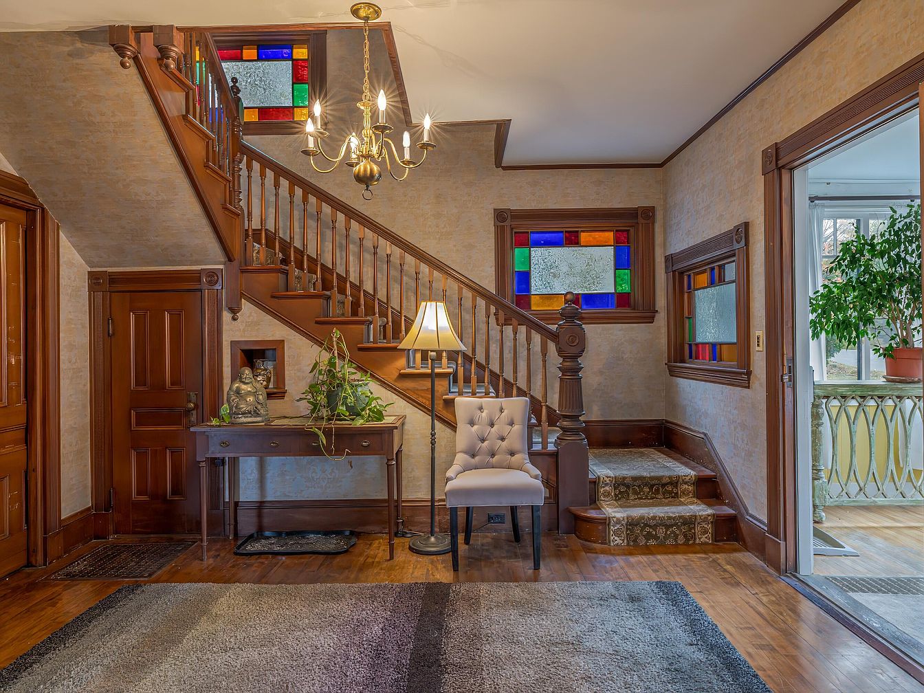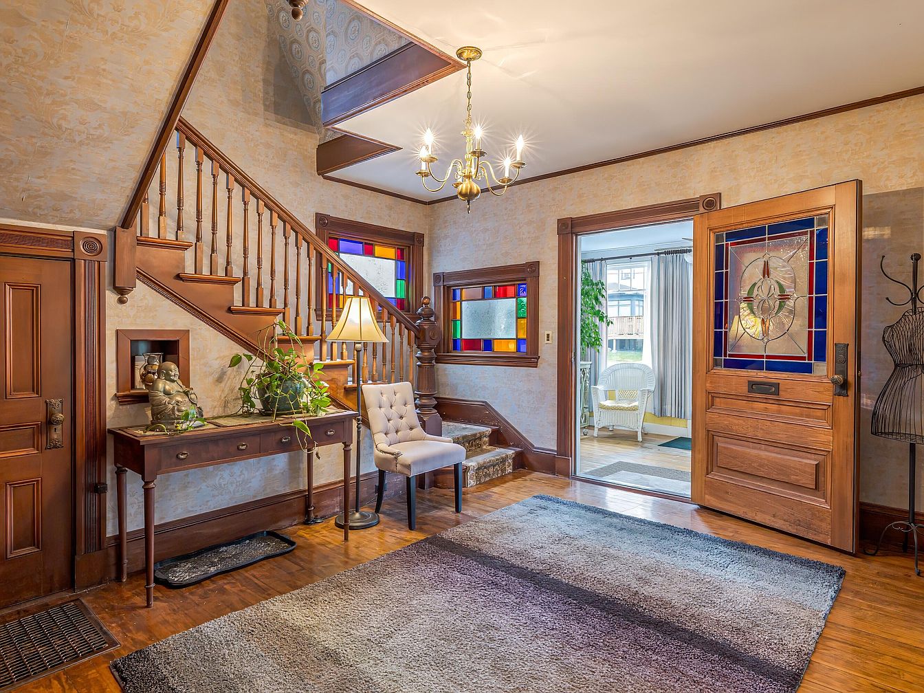 The entryway features elegant wooden architecture, characterized by rich mahogany tones. A grand staircase ascends, showcasing intricately turned spindles and a polished banister, illuminated by a stylish chandelier. Colorful stained glass windows above the staircase add vibrant splashes of red, blue, and green, creating an inviting ambiance. A sleek console table, adorned with a small decorative statue and eclectic plants, enhances the space’s warmth. A plush armchair offers a cozy spot, contrasting with the sophisticated wooden framework and textured wallpaper. The entryway’s layout seamlessly connects the inner home to an inviting outdoor area through open double doors.