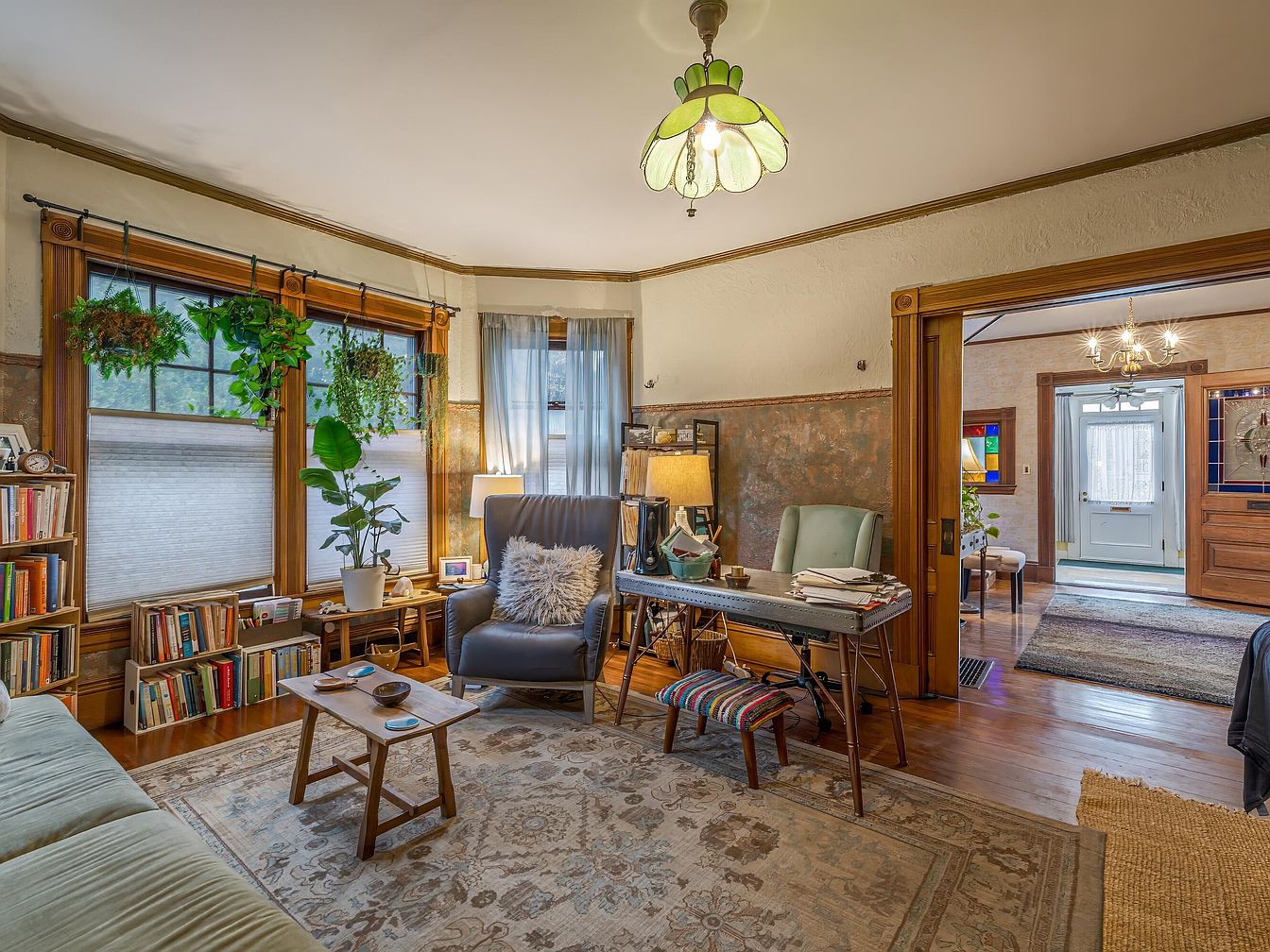 This cozy living room features a blend of traditional and modern design elements. The walls are adorned with a rich brown wood trim, enhancing the warm atmosphere. Large windows allow natural light to filter through, framed by sheer white curtains, with robust greenery creating a vibrant touch. A plush, light-colored sofa sits on an intricately patterned area rug, complemented by a simple wooden coffee table. To the side, a wooden bookshelf showcases a variety of books, while a retro desk with colorful accents adds a creative flair. The ceiling light fixture has a vintage design, adding character to the room.