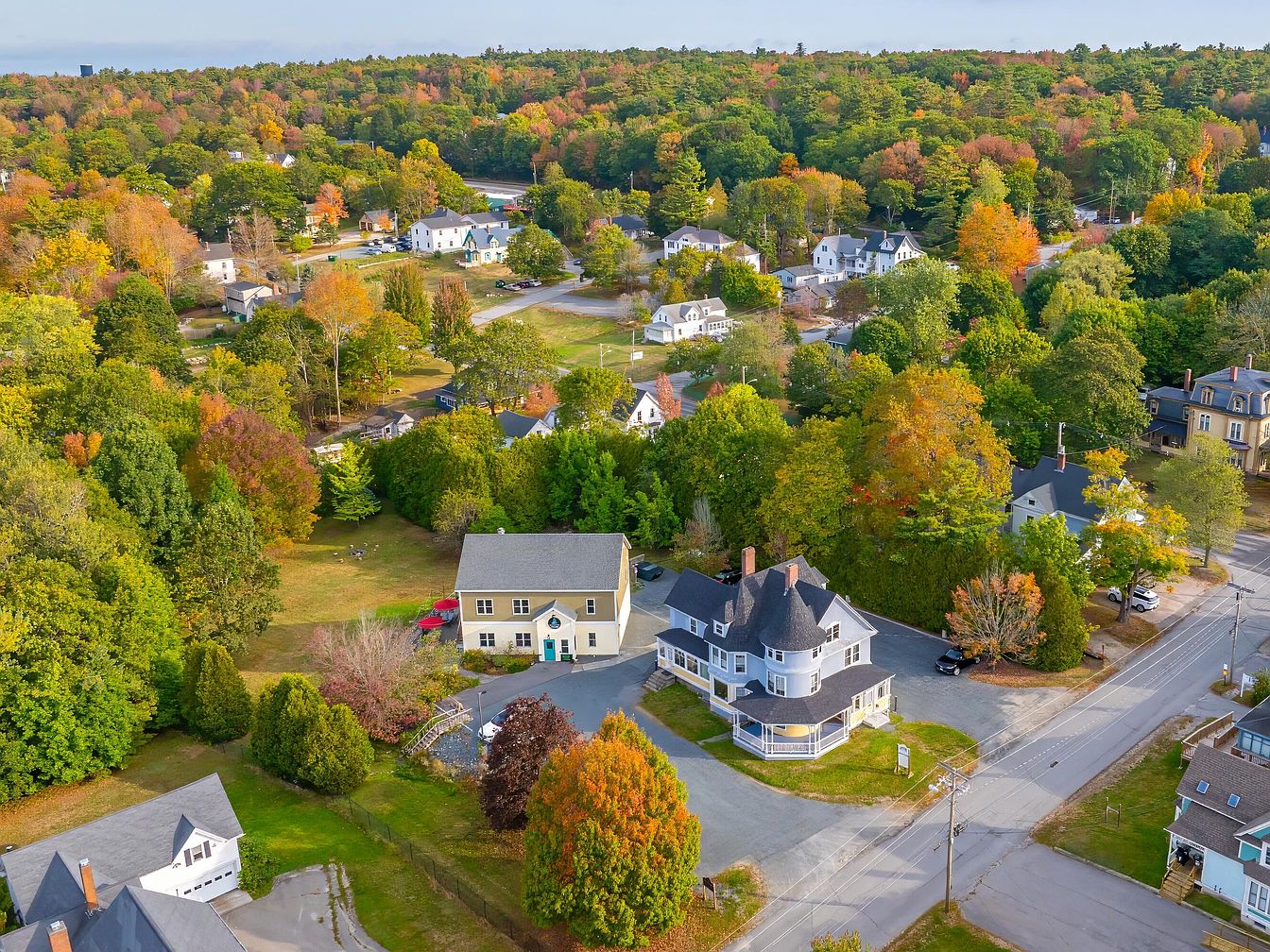 An expansive aerial view showcases a historic neighborhood adorned with vibrant autumn foliage. The houses, a mix of architectural styles, are interspersed among lush trees. Highlighted is a prominent two-story home with a circular turret, characterized by its distinct roofline and wrap-around porch. Nearby, another house features a clean, light-colored facade with teal accents, standing out amid the rich greens and oranges of the trees. The streets are quiet, with winding roads leading through the neighborhood, creating an inviting and serene atmosphere. This idyllic scenery embodies the charm of a small American town.