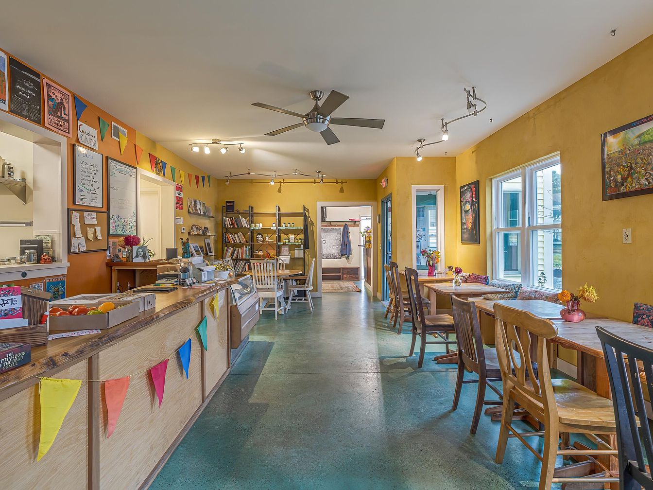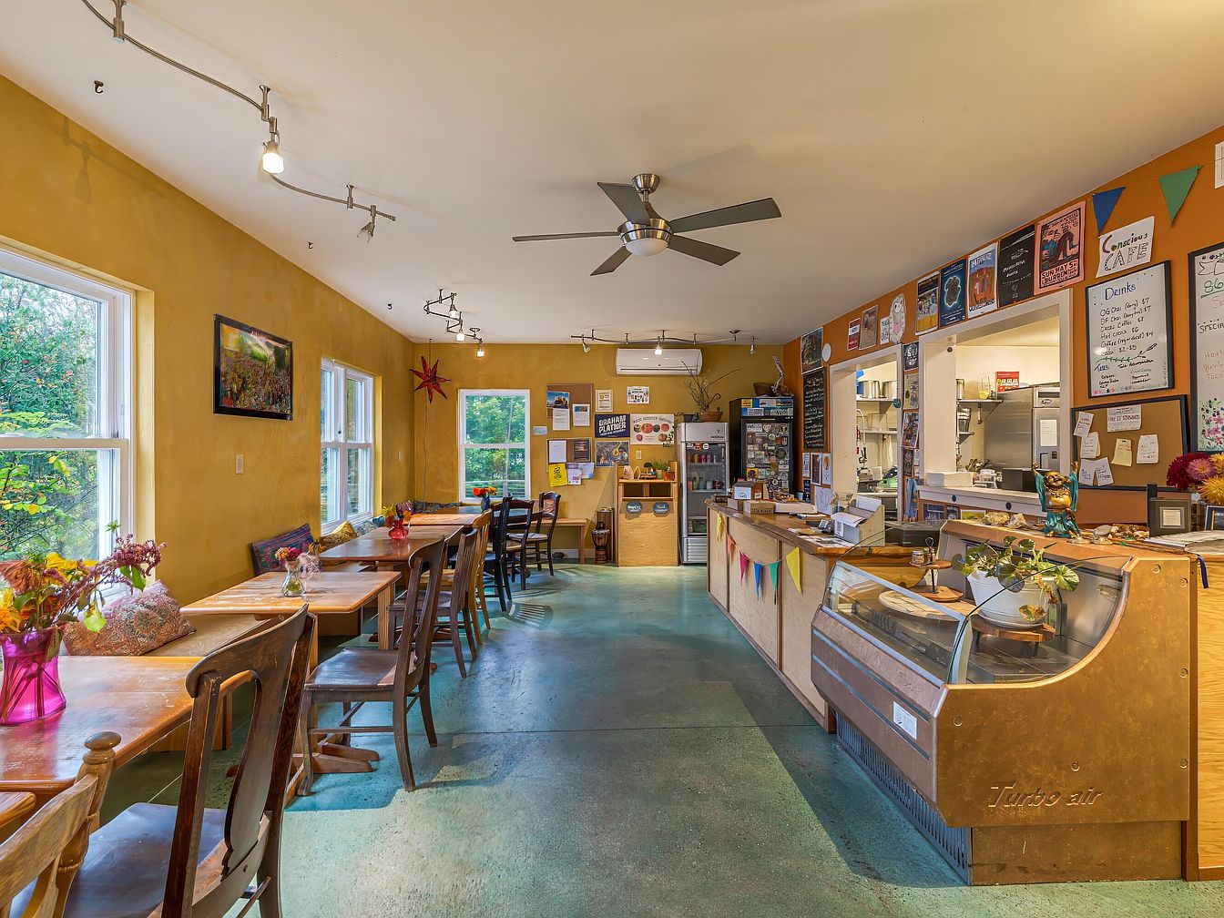 A lively café space featuring warm yellow walls that create an inviting atmosphere. The room showcases an open layout, with a combination of wooden furniture, including brown tables and chairs along the sides. A long counter displays fresh fruits and baked goods, paired with a display case adding a touch of charm. Colorful triangular bunting strung across the ceiling enhances the cheerful ambiance. Large windows allow natural light to pour in, illuminating both the cozy seating areas and the small bookshelf filled with books. Decor includes vibrant artwork that adds personality to the space.
