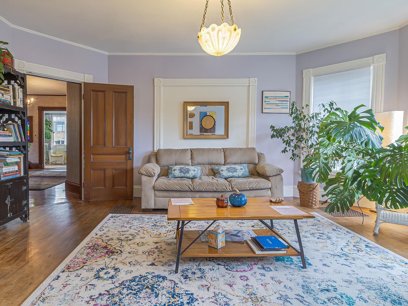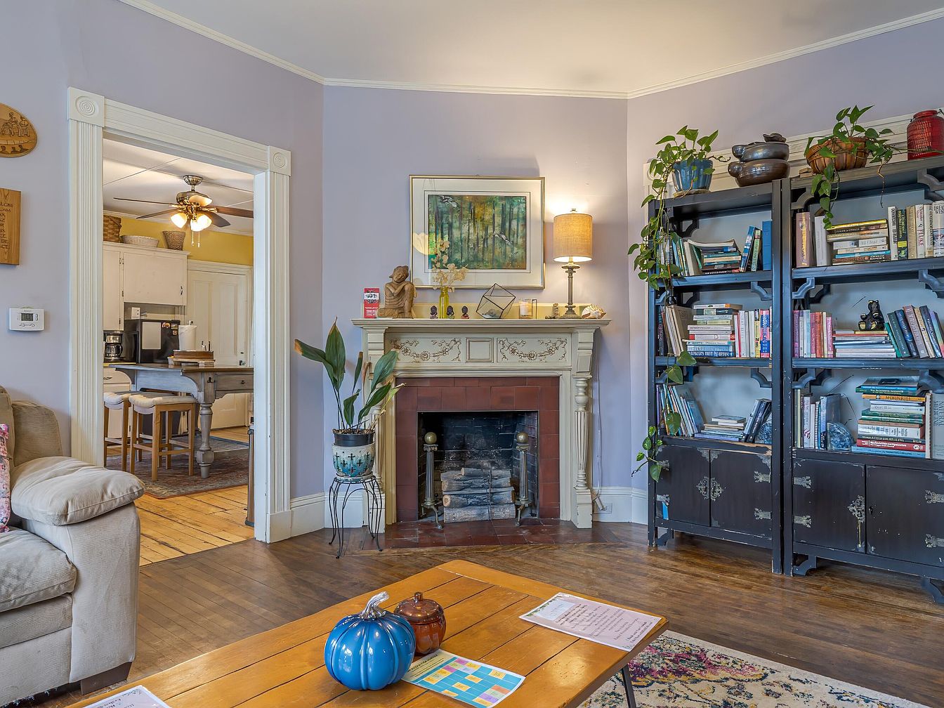 This living room features a cozy arrangement with a blend of classic and modern aesthetics. The walls are painted soft lavender, creating a calming atmosphere. A traditional fireplace with intricate molding serves as a focal point, complemented by a warm lamp beside it. A rich wooden coffee table centers the space, adorned with a decorative blue pumpkin. Lush green houseplants add vibrancy, while a black bookshelf filled with books injects character. Visible through the archway, a glimpse of the adjoining kitchen reveals a functional layout with light cabinets, enhancing the overall inviting ambiance of this historic home.