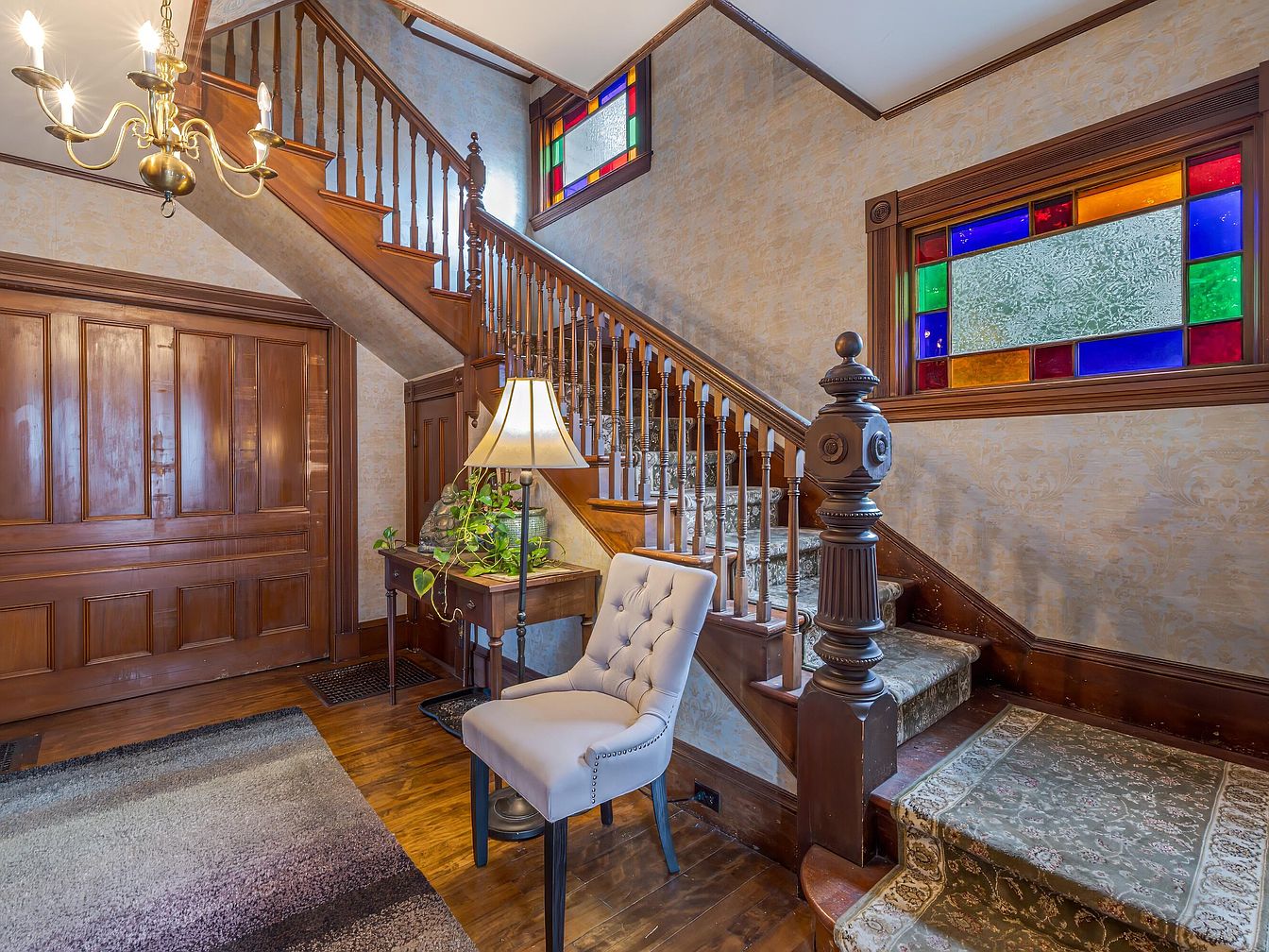 The entryway features an elegant wooden staircase that ascends with ornate balusters, showcasing classic craftsmanship. Rich mahogany paneling adorns the walls, providing a warm contrast to the softly patterned wallpaper. Stained glass windows introduce vibrant hues of red, green, and blue, enhancing the natural light filtering through. A plush, light-colored tufted chair is positioned beside a small side table with an underlit lamp, creating a cozy reading nook. The hardwood floor, partially covered by a textured area rug, complements the intricate details of the staircase, while potted greenery adds a refreshing touch of life.