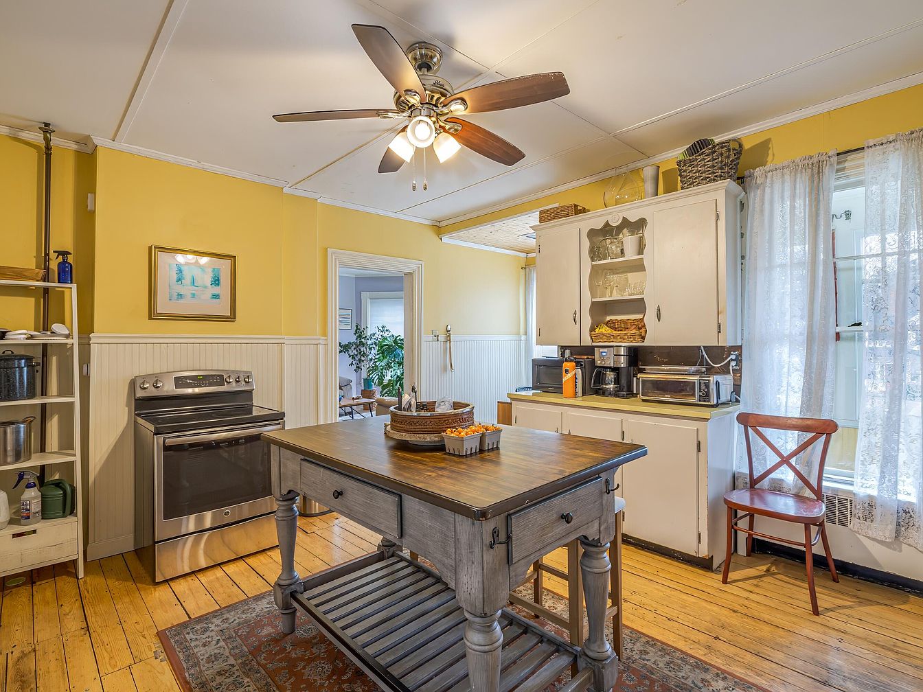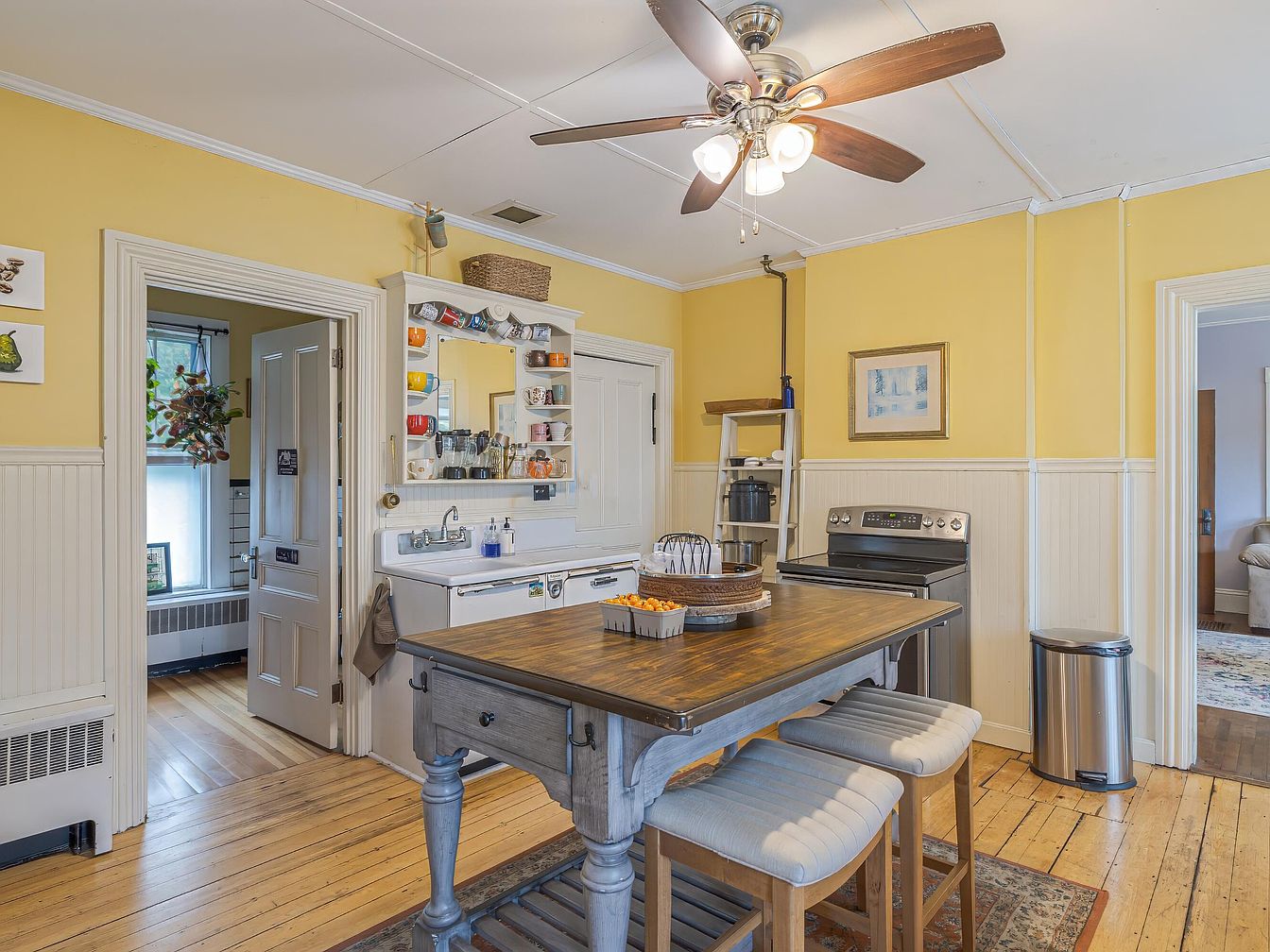 A cozy kitchen features pale yellow walls, enhancing the warm ambiance. The space includes a wooden table with gray legs, surrounded by soft, upholstered stools. A vintage feel is emphasized by the light hardwood flooring. Above the table, a ceiling fan circulates air while adding character. White cabinetry with glass-front doors displays colorful mugs and dishware, reflecting a homely charm. A stainless-steel stove and a small trash can occupy the corner, integrating modern convenience. Natural light streams through the window, highlighting a blend of rustic and contemporary design, promoting a welcoming atmosphere ideal for gatherings.
