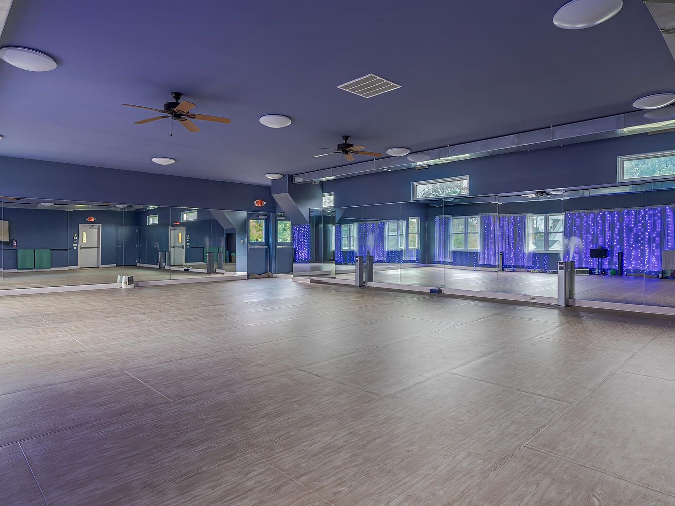 A spacious dance studio featuring a smooth, light-colored wood floor that extends across the area, enhancing the sense of openness. The walls are painted in a calming deep blue, complemented by mirrored sections reflecting the expansive space. Above, large ceiling fans circulate air, while bright, recessed lighting illuminates the room. Windows allow natural light to filter in, creating a vibrant atmosphere. To one side, a curtain adorned with soft, twinkling lights adds a whimsical charm. The overall design emphasizes both functionality and aesthetic appeal, making it ideal for various dance classes and rehearsals.