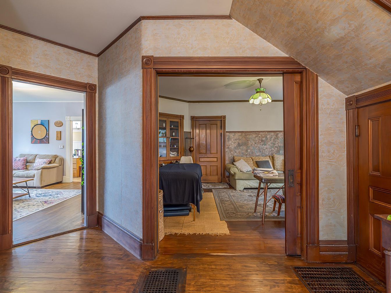 A spacious hallway showcases rich wooden trim and doorways leading to adjacent rooms. The walls are adorned with light, patterned wallpaper that adds a touch of elegance. The dark hardwood flooring complements the warm tones of the woodwork, reflecting natural light. To the left, a cozy living area is visible, featuring a soft, beige couch layered with decorative pillows, while a small coffee table sits nearby. On the right, a glimpse of another room reveals a charming light fixture, accentuating the home’s historic charm. Architectural details enhance the inviting atmosphere, creating a harmonious flow between spaces.