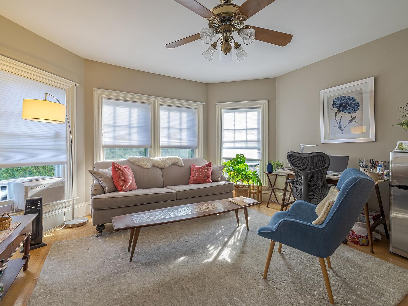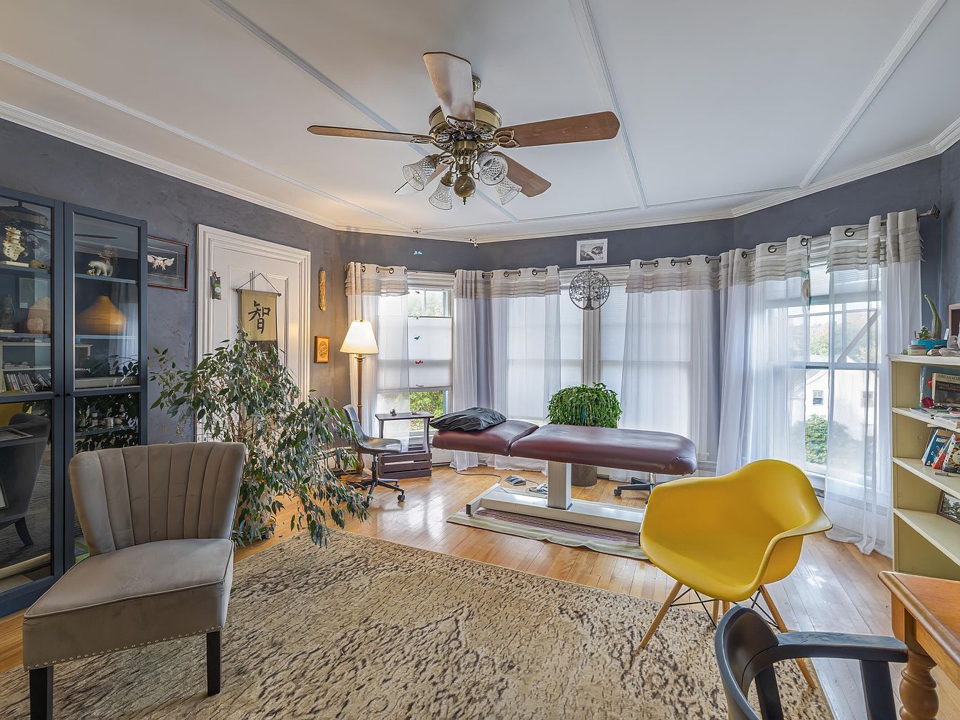 A cozy living room featuring an eclectic mix of furnishings and decor. Gray walls complement multi-paneled windows adorned with sheer white drapes, allowing natural light to enhance the space. In the foreground, a stylish, curved gray chair contrasts with a bold yellow armchair, showcasing modern design. A rich wooden floor adds warmth, while an intricate area rug ties the room together. A glass-front cabinet displays decorative items, hinting at personal stories. A ceiling fan contributes to a relaxed atmosphere. Additional seating includes a treatment table, suggesting a space for both comfort and wellness activities.