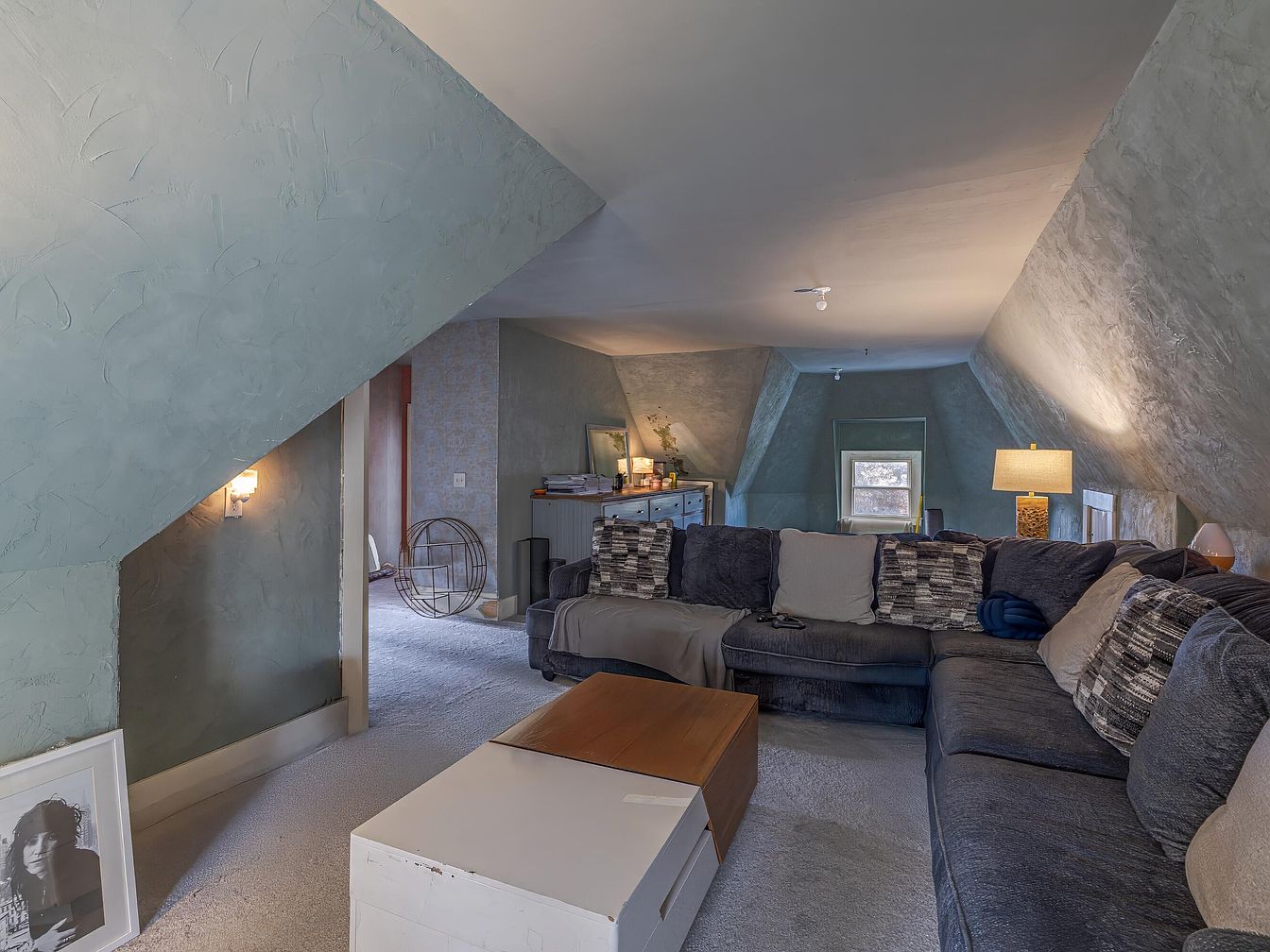 This cozy attic lounge features sloped ceilings and a charming pastel color scheme with soft blue walls. A plush sectional sofa dominates the space, adorned with various textured cushions in muted tones, creating a welcoming atmosphere. The room is adorned with a blend of modern and vintage elements, such as a minimalist wooden coffee table and a unique wire-shaped decor piece. Soft lighting from a stylish floor lamp enhances the relaxed vibe, while a small window allows natural light to filter through. The carpet adds warmth, making it a perfect retreat within the home.