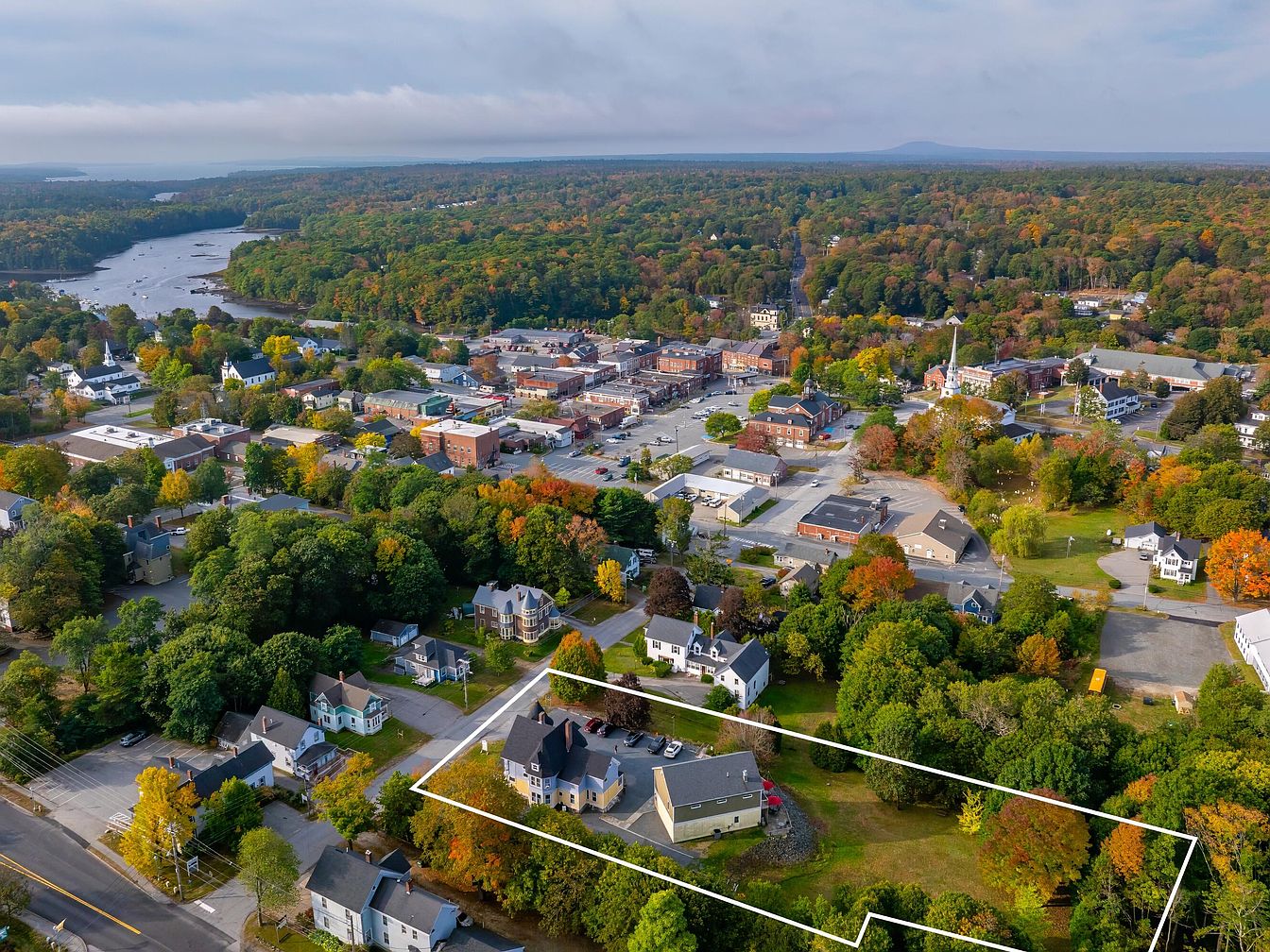 The image presents a sweeping aerial perspective of a historic American neighborhood showcasing a blend of urban development and natural beauty. Varied architecture is visible, featuring both modern and traditional homes amid lush green foliage, with vibrant fall colors peeking through the trees. The surrounding area includes commercial buildings and roads, indicating a small-town atmosphere with a close-knit community. The waterway meandering through the landscape adds tranquility, while the distant hills create depth. Overall, the scene harmonizes the residential and natural elements, reflecting a picturesque suburban lifestyle.