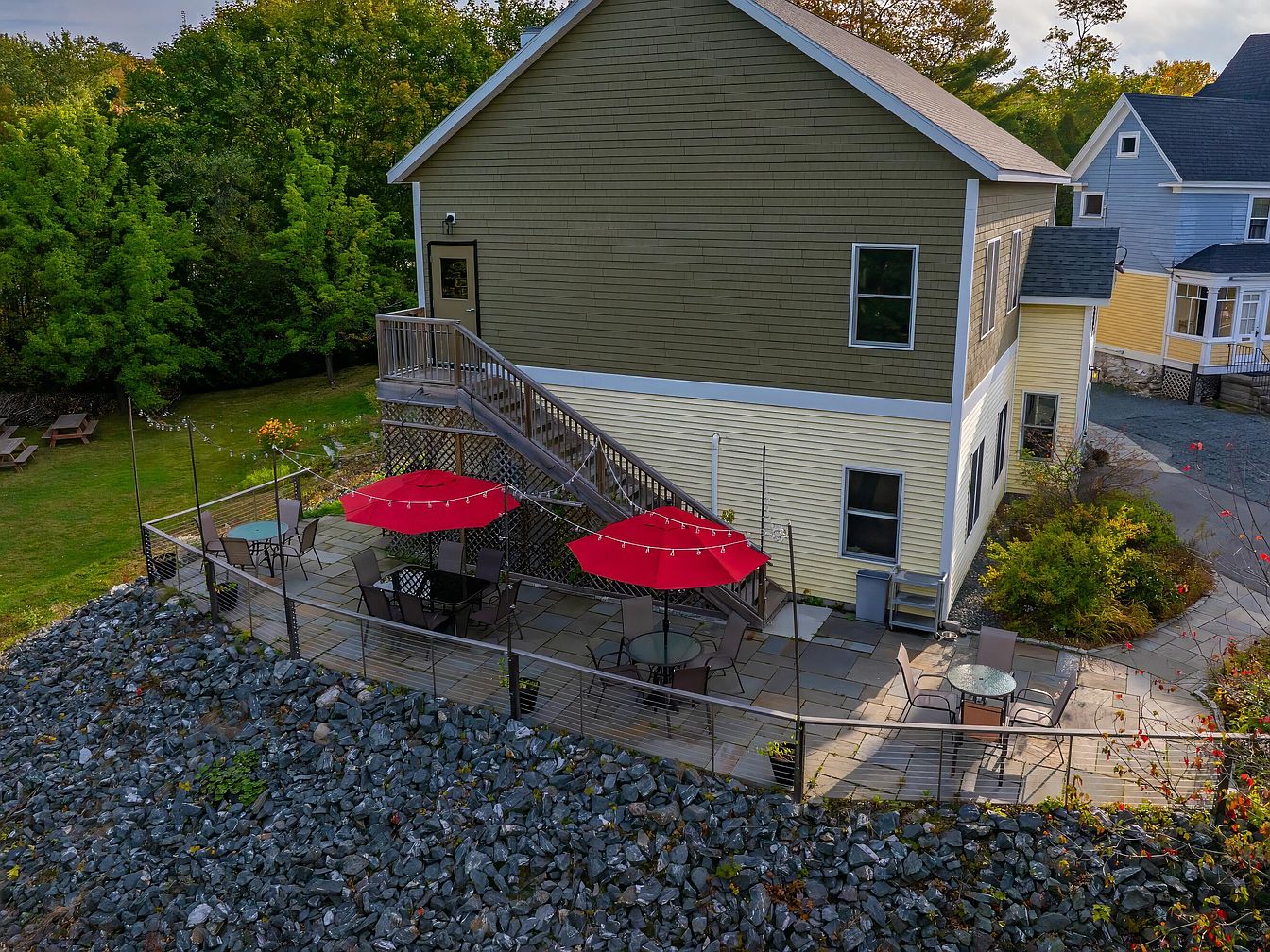 A spacious outdoor patio features multiple seating areas arranged around circular tables. Two large, vibrant red umbrellas provide shade and contrast against the neutral stone patio and the earthy tones of the house’s siding. The building showcases a traditional American architectural style with a two-tone color scheme of olive green and pale yellow. A winding staircase leads to the upper level. Decorative string lights add a cozy ambiance, surrounded by greenery and colorful flower beds. The landscape transitions smoothly, with a stone border around the patio, complementing the natural environment of trees and lawn space beyond.