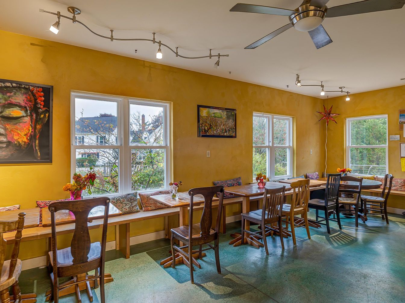 This dining area features a warm, inviting yellow plaster wall, enhancing the cozy atmosphere. Large windows allow natural light to fill the space, complemented by track lighting overhead. A mix of wooden tables and chairs offers a rustic charm, while colorful cushions add comfort. Artwork, including a striking Buddha portrait and lively landscapes, energizes the walls. A starburst decorative piece hangs near one window, enhancing the eclectic design. Fresh flowers on tables bring a vibrant touch, creating an inviting ambiance for gatherings. The polished concrete floor adds an industrial feel, balancing the warmth of the wood elements.