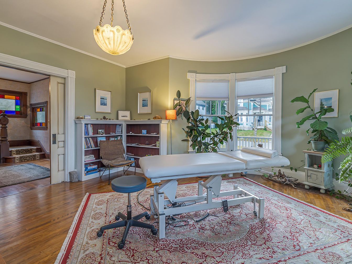 This tranquil therapy room features a soothing green color scheme that promotes relaxation. A white treatment table is centrally placed on a richly patterned red and ivory area rug, enhancing comfort. Modern and vintage elements coexist with light wood flooring and a classic chandelier overhead. Natural light floods in through large, rounded windows adorned with white blinds, complemented by potted plants that bring life to the space. A wall-mounted bookshelf houses various books, while a stylish chair adds to seating options. The decor includes framed coastal art, creating a serene atmosphere ideal for therapy sessions.