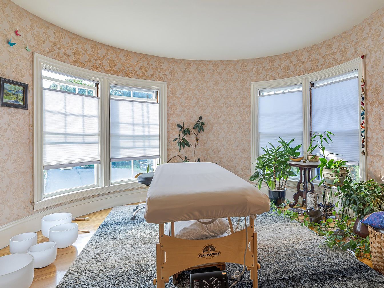 This sunroom features a gentle, curved layout with three large windows allowing natural light to flood the space. The walls are adorned with soft peach wallpaper, embellished with a subtle floral pattern. A massage table, central to the room, invites relaxation. Around it, lush green plants add a vibrant touch, while a round, wooden side table displays potted greenery. The floor is a warm wood, complemented by an area rug in shades of blue and gray, creating a cozy atmosphere. Decorative details include small colorful birds on the wall, enhancing the serene and inviting ambiance.