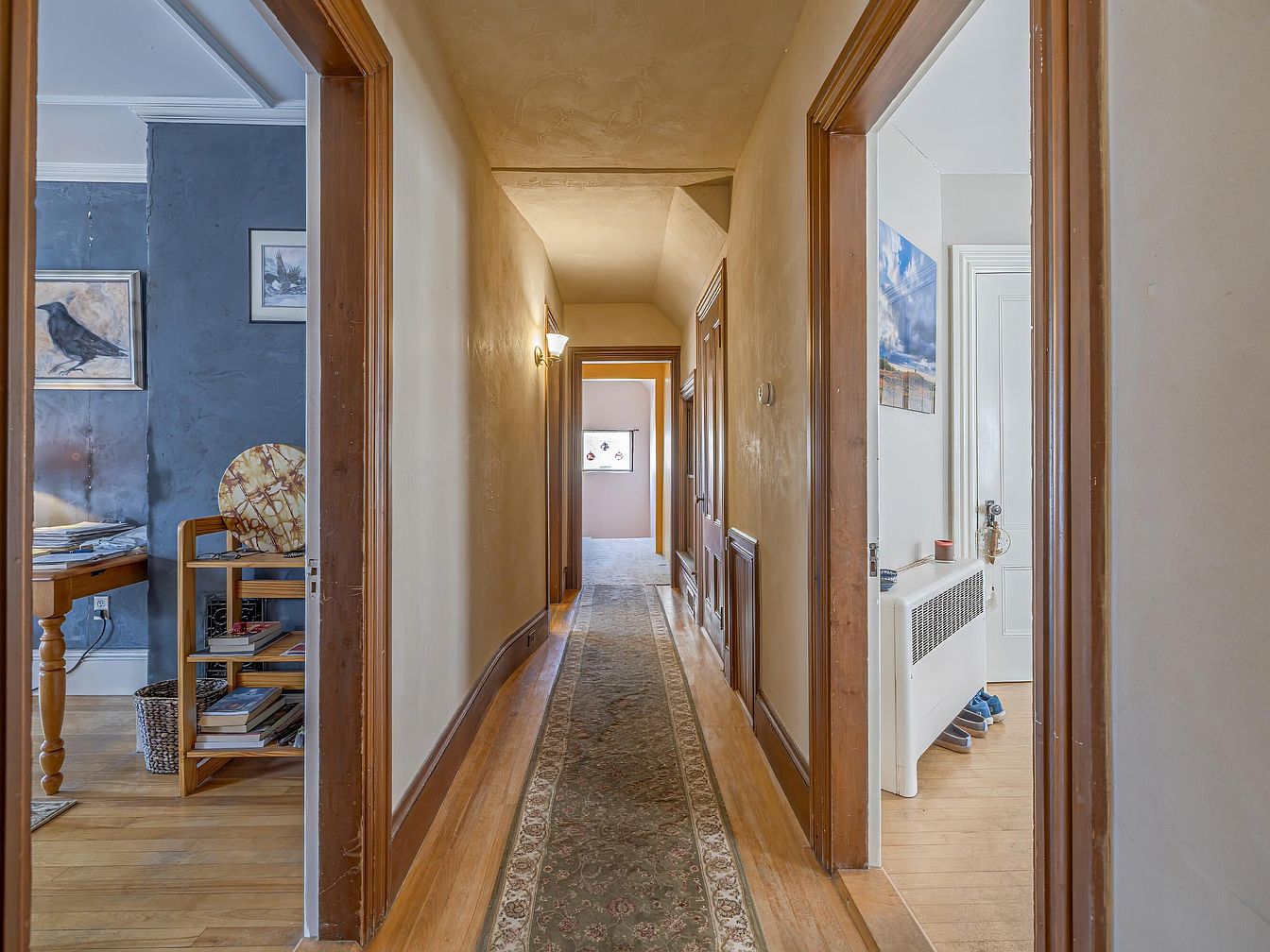A narrow hallway connects various rooms in a historic American home. The walls feature warm beige tones with wooden trim that adds charm. A patterned runner rug stretches down the polished wooden floor, enhancing the inviting atmosphere. On the left, glimpses of a study showcase a dark blue accent wall adorned with framed artwork and a wooden table piled with books. Natural light filters through rooms at both ends, illuminating framed photos and creating a cozy ambiance. Near the right wall, a vintage radiator and a couple of shoes hint at everyday life and warmth, making the space welcoming.