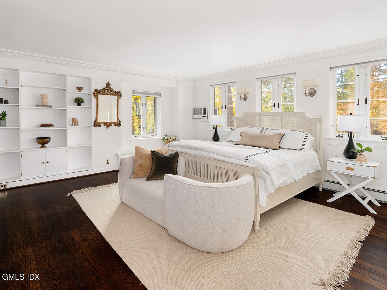 A serene bedroom layout features a large, elegantly framed bed with simple white bedding and a decorative pillow, embraced by natural light from multiple windows. The walls are painted in a soft white, complementing the dark hardwood floor that adds warmth and depth. A plush, circular accent chair is positioned near the bed, enhancing comfort. Beside the bed, a sleek white nightstand with a small plant creates a fresh touch. A vintage mirror framed in ornate gold accents hangs above the shelving unit, which displays curated decor elements like a small plant and decorative objects, enriching the aesthetic.