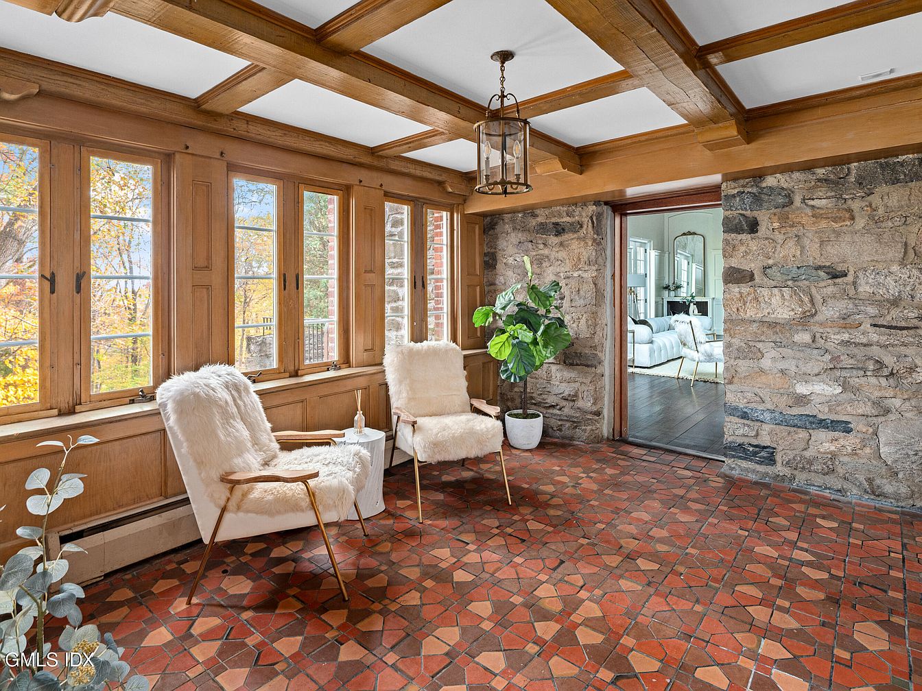 This sunroom features a warm, inviting atmosphere created by wooden beams and stone walls. Large, multi-pane windows allow natural light to flood the space, highlighting the autumnal scenery outside. Terracotta tiles with a distinctive pattern cover the floor, enhancing the rustic charm. Two plush, white armchairs with fur upholstery offer a cozy seating option, complemented by a small, round side table. A decorative plant adds a touch of greenery, bringing life to the earthy tones. The open doorway leads to another room, creating a seamless flow between spaces while maintaining the home’s historic character.