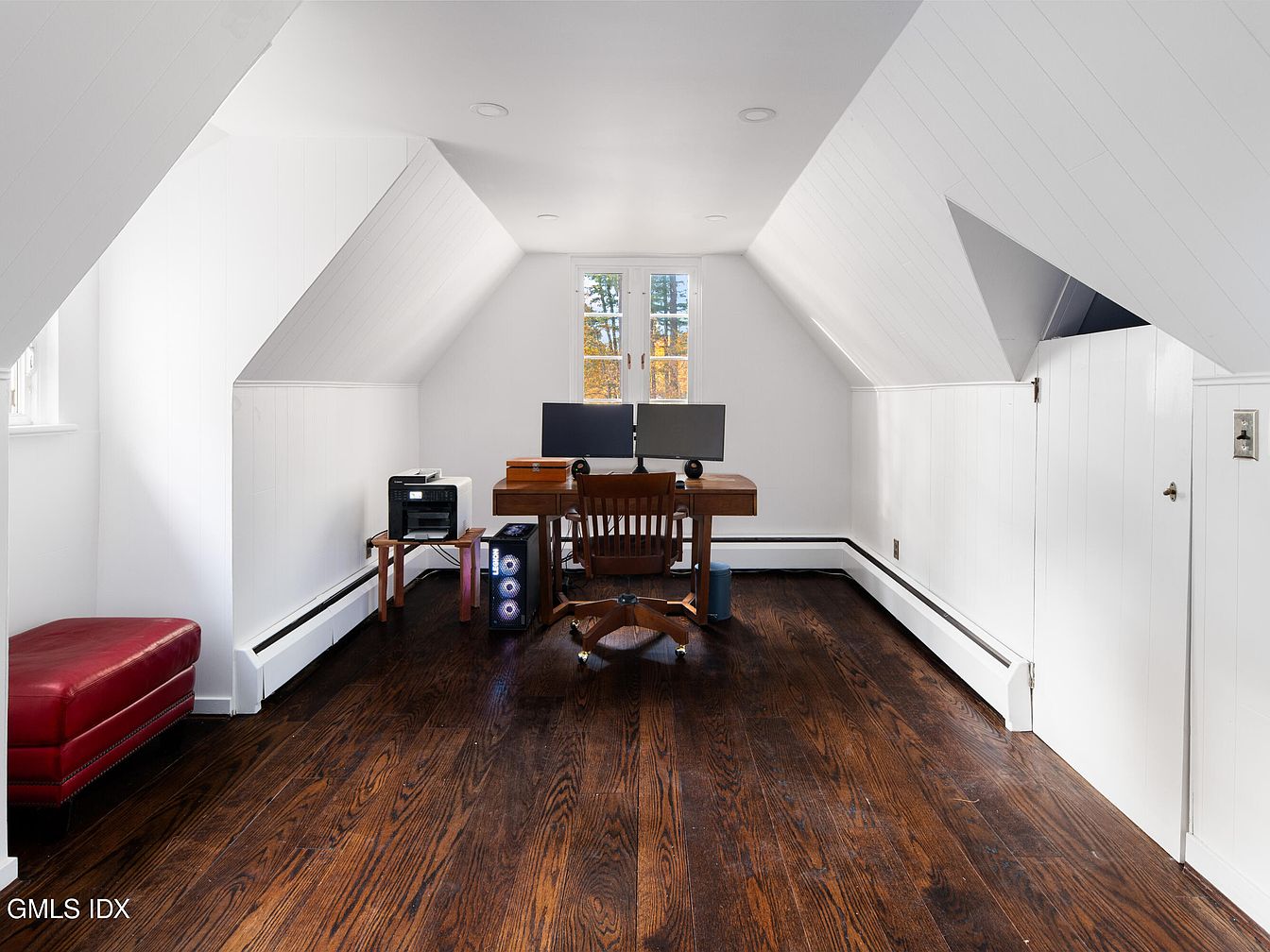 This attic space is transformed into a functional home office, characterized by a clean, minimalist aesthetic. The sloped ceiling with white paneling creates an open feel, complemented by natural light streaming through a small window. Dark hardwood floors add warmth and contrast against the crisp white walls. A wooden desk sits against one wall, accompanied by a comfortable chair, providing a cozy workspace. A small black cabinet houses a printer and a sleek computer tower, showcasing modern utility. A vibrant red leather bench offers additional seating, subtly enhancing the color palette while maintaining a relaxed ambiance.