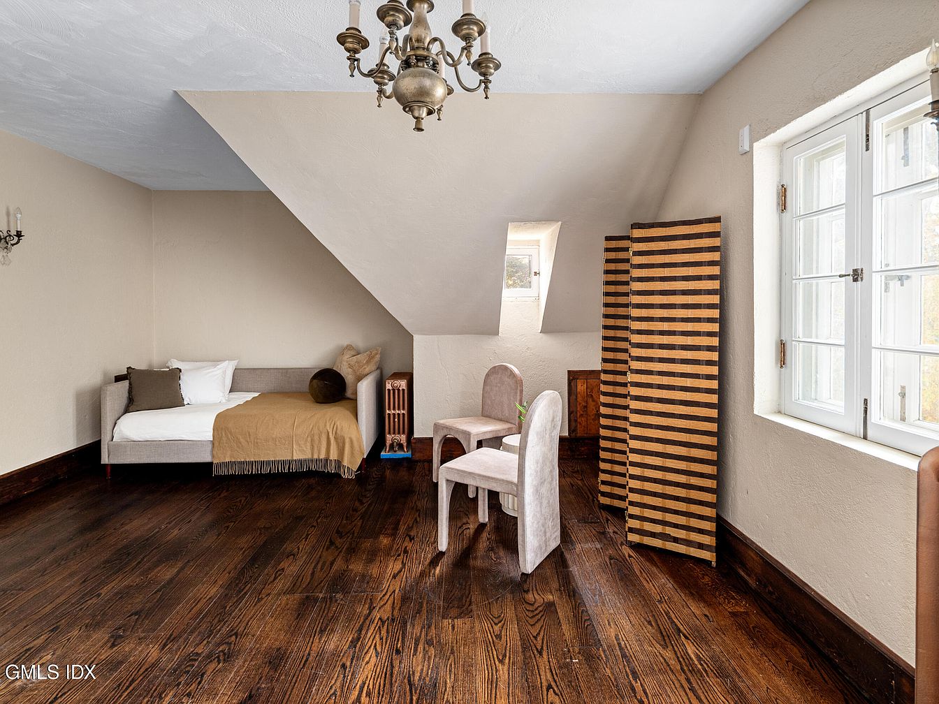 The attic bedroom features an angled ceiling with a soft blue finish, complementing the warm beige walls. A daybed, adorned with a cozy brown throw and subtle accent pillows, is positioned against the sloped wall, inviting restful relaxation. To one side, a sleek wooden room divider adds a touch of privacy, while a small vintage-styled radiator sits nearby. Light wooden floors enhance the spacious feel, contrasting with the dark finish of the baseboards. The room is illuminated by a charming chandelier, and ample natural light filters in through the multi-paned windows, creating a serene and inviting atmosphere.