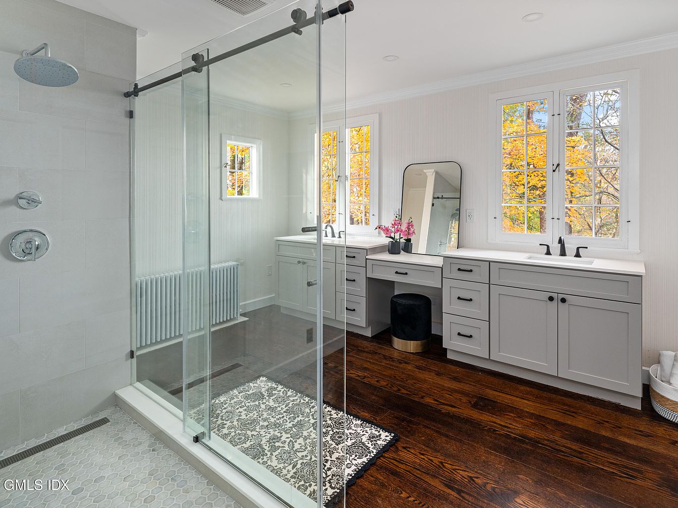 This spacious bathroom features a sleek glass shower enclosed by a sliding door, adorned with modern fixtures. The light gray tile complements the rich, dark wood flooring. Dual vanities boast stylish gray cabinetry, each topped with pristine white countertops. Large, framed mirrors reflect natural light from the windows, enhancing the bright ambiance. Decorative accents include a black marble stool and a vase of fresh flowers, adding elegance. A vintage-style radiator contrasts beautifully against the contemporary design. Overall, a harmonious blend of modern and classic elements creates a tranquil retreat.